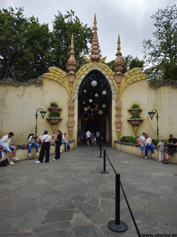 Über den Haupteingang führt ein Weg erst einmal in ein Areal relativ in der Parkmitte. Hier befindet sich in einem schlossähnlichen Gebäude die Neuheit des Jahres 2017 wieder - Symbolica. Symbolica ist irgendwie anders als die üblichen Dark Rides. Man fährt zwar in einer Gondel an verschiedenen Szenen vorbei, doch interessant ist, wie das hier inzeniert wird. Die Gondeln sind scheinbar ohne Führungsschienen unterwegs. Es starten jeweils drei Gondeln parallel, die aber nicht einfach hintereinander her fahren, sondern sich immer wieder aus dem Verbund lösen, für einen kurzen Abschnitt einen anderen Weg nehmen, die Position wechseln oder umeinander herumfahren. Es erscheint wie ein frei fahrendes Chaos. Wer das aufmerksam beobachtet, bekommt mit, dass man sich am Start für eine von drei Touren durch das Schloss entscheidet und eine Tour auch immer gleich aussieht. Die drei Gondeln starten eben nur gleichzeitig zu den drei Touren.