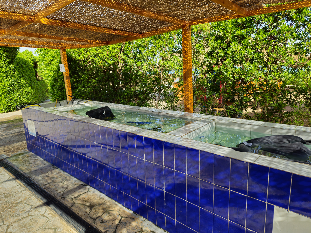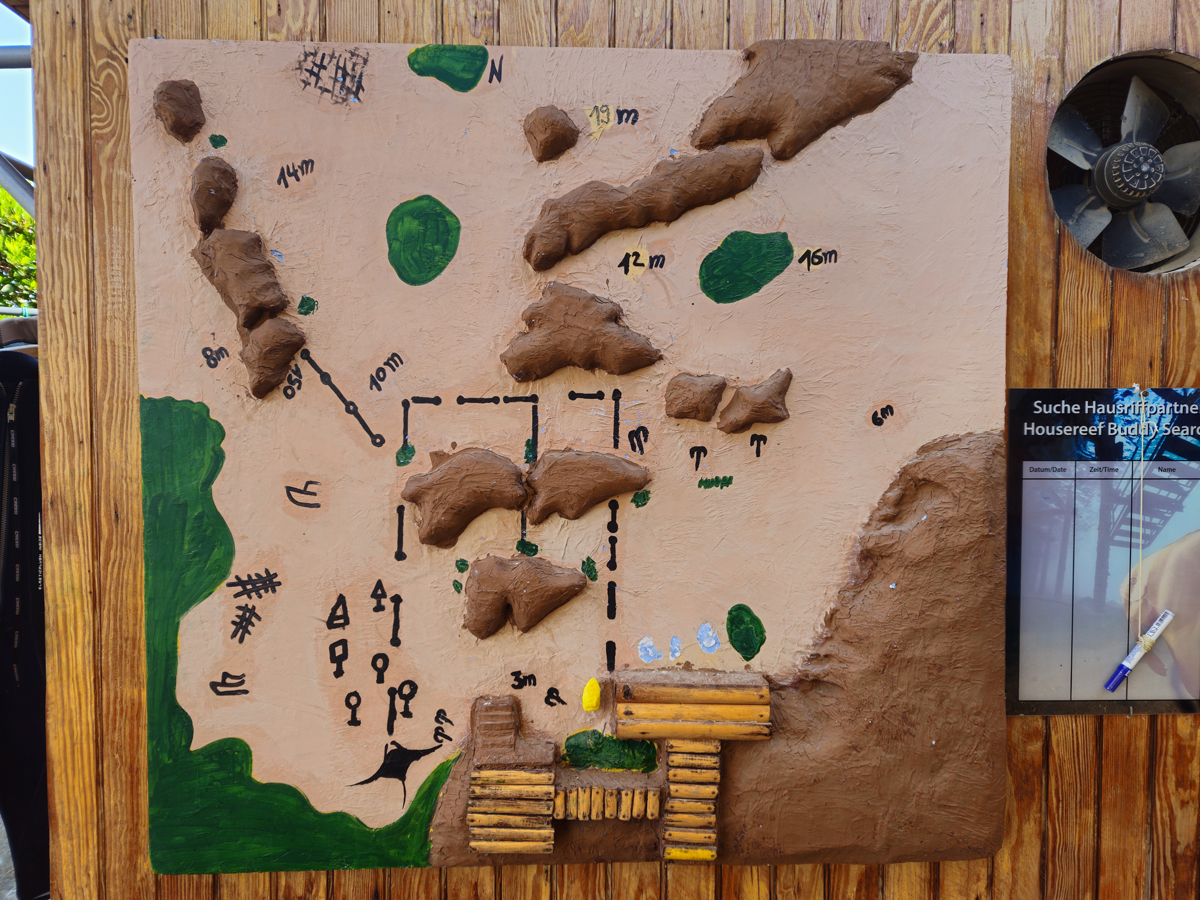 Neben den Tauchausfahrten gibt es direkt an der Basis ein Hausriff. Es besteht aus mehreren Fels- und Korallenblöcken, sowie einigen künstlichen Aufbauten. Die Sicht ist nicht so toll, da in der Makadi Bay natürlich einiges an Bootsverkehr ist, aber für den Tauchgang zwischen durch oder Orientierungsübungen reicht es. Nachttauchgänge werden aktuell nicht mehr angeboten (auch am Hausriff nicht). Das sei, so wurde auf Nahcfrage erklärt, inzwischen leider nicht mehr erlaubt.