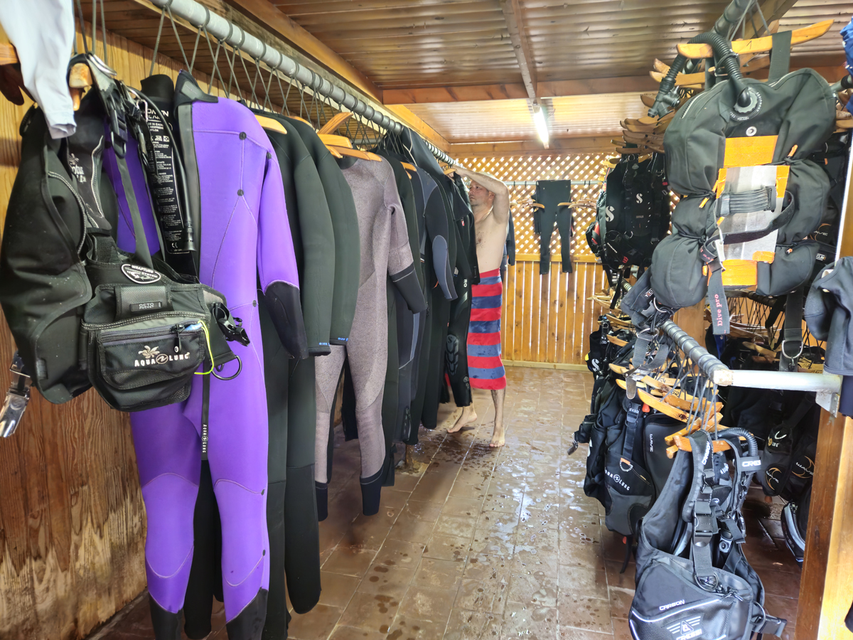 Interessant wird es nach diesem formellen Kram: Man nimmt sich Zeit für einen Basisrundgang, in dem alle Räumlichkeiten gezeigt, die Abläufe und Besonderheiten erklärt und das Anmeldeverfahren für die Touren erläutert wird. Jeder Gast erhält eine eigene, abschließbare Box für die Ausrüstung. Für Jackets und Anzüge gibt es einen Trockenraum, der ebenfalls verschlossen ist, wenn die Basis nicht geöffnet hat. Dort sind alle Bügel durchnummeriert. Zu jeder Box gehören also feste Plätze für Jacket und Anzug.