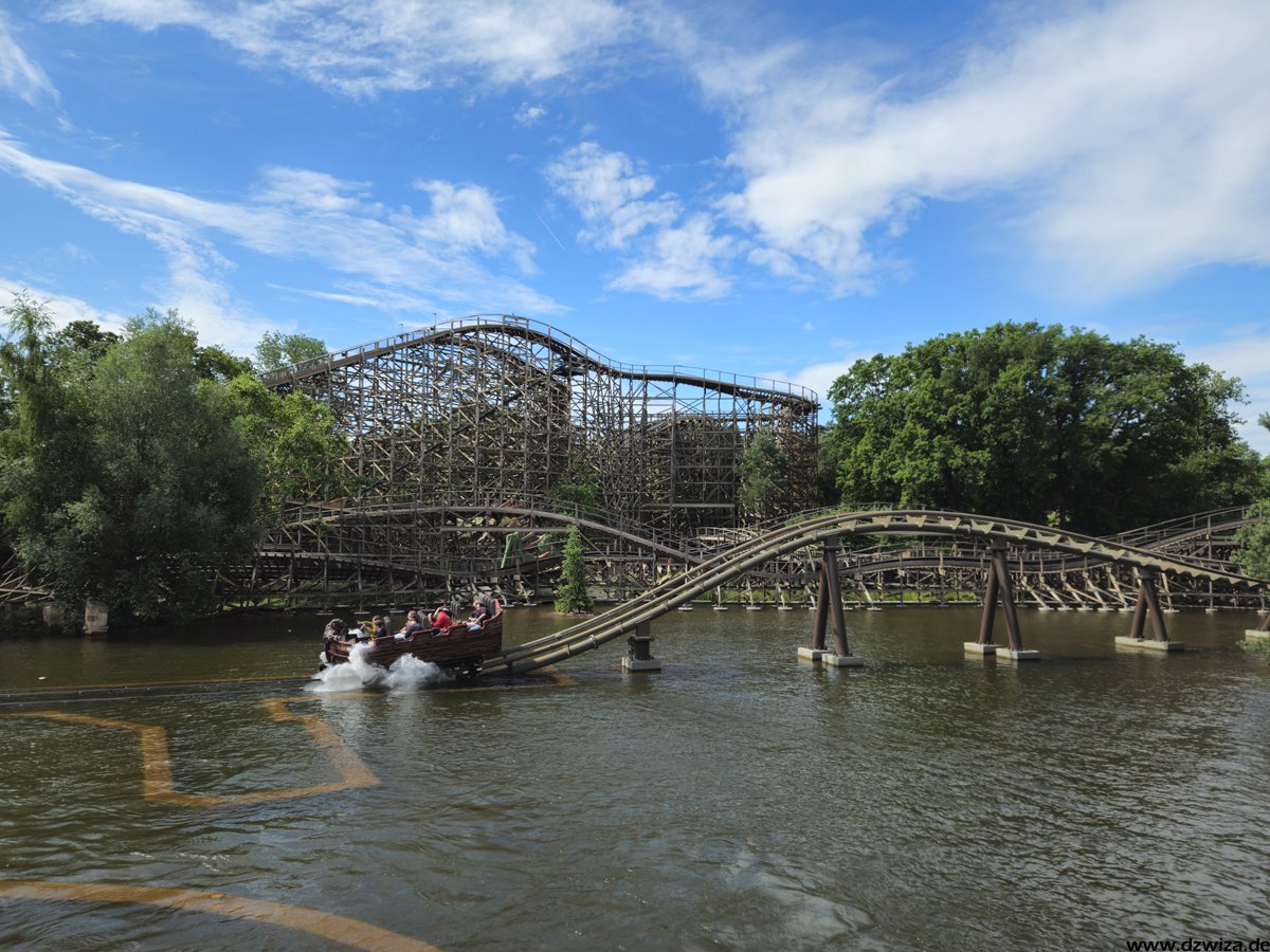 Am großen See vorbei kommt man oberhalb (nördlich) des Sees und unterhalb (südlich) davon weiter. Südlich geht es zurück in Richtung Symbolica, also folgen wir dem nördlich Weg um den See herum. So kommen wir den Themenbereich Ruigrijk (Rohland). Dieser Themenbereich ist für alle, die es etwas thrilliger mögen, der wichtigste Anlaufpunkt. Hier steht Python, die 750 Meter lange Looping-Achterbahn von Vekoma (seit der letzten Überholung gilt: es gibt auch bei Vekoma bequeme Züge / Sitze / Schulterbügel, kaum zu glauben, aber möglich). Die Doppelholzachterbahn Joris en de Draak ist ein Rennen auf zwei Kursen, die Bahnen fahren immer wieder nebeneinander her und überholen sich knapp. Weiterhin ist hier aber noch die Wasser-Achterbahn Vliegender Hollander zu finden und, als Neuheit aus 2015, der B&M Dive Coaster Baron 1898 (lieber Heidepark, so baut man das, nicht wie bei Krake).