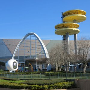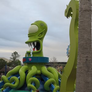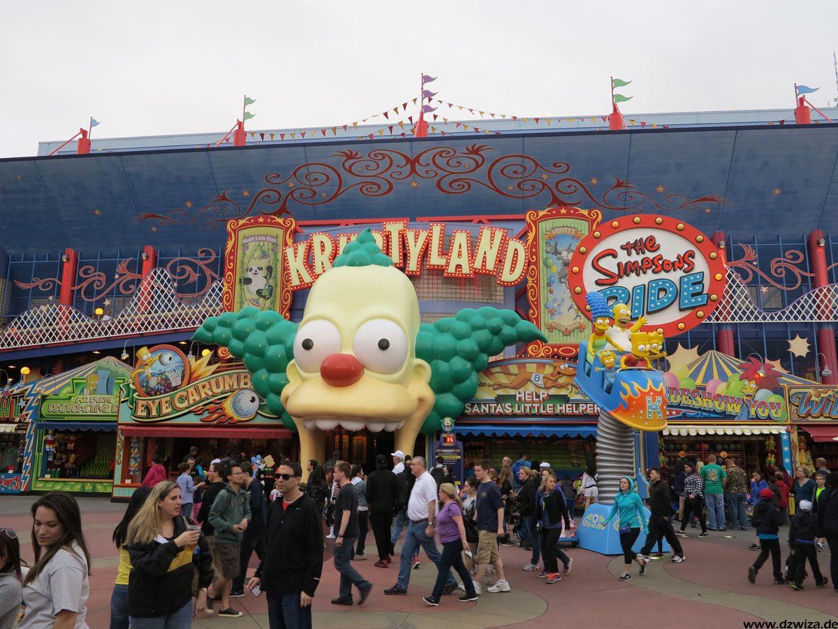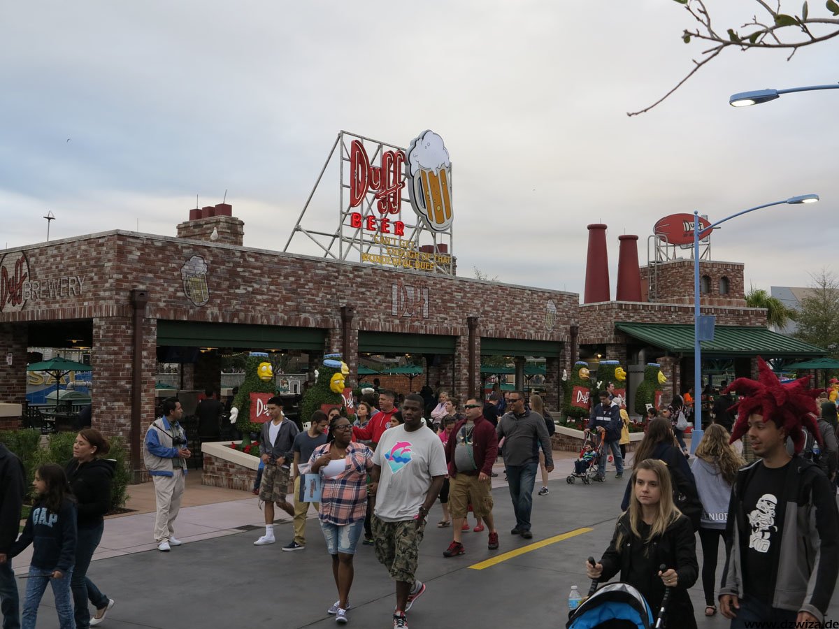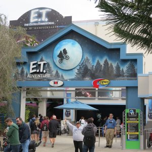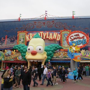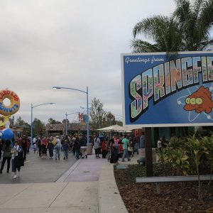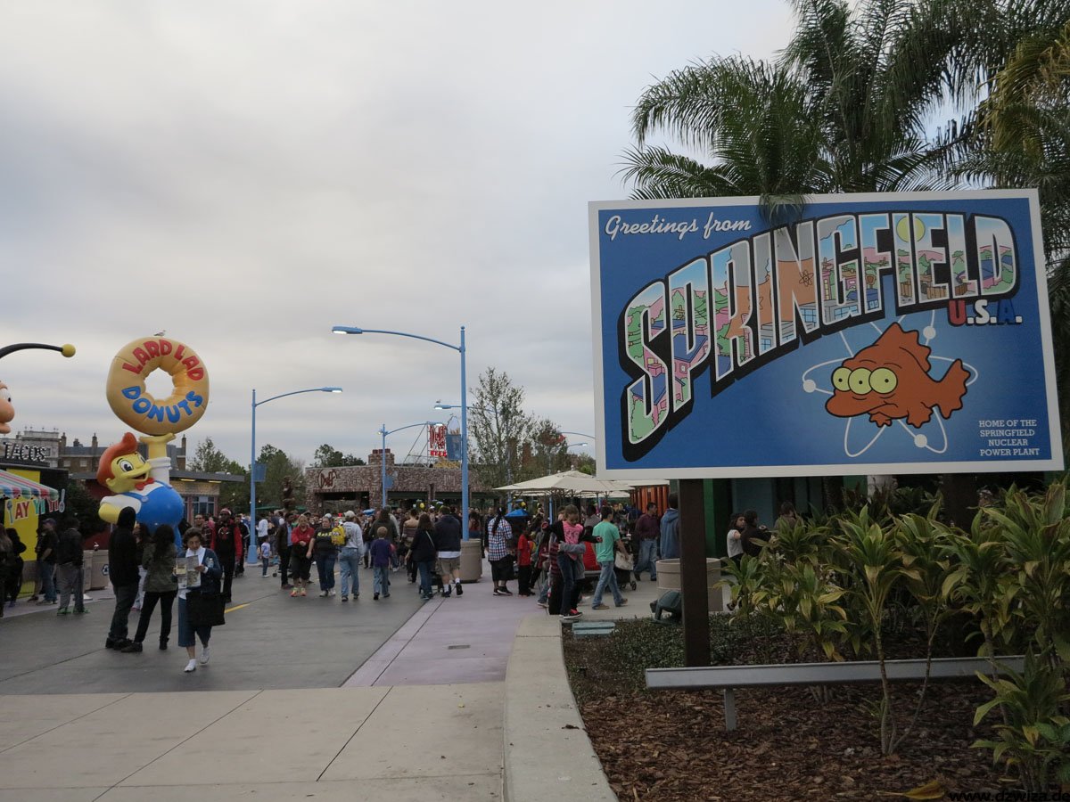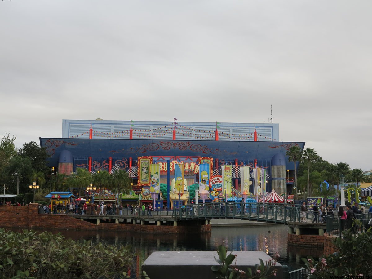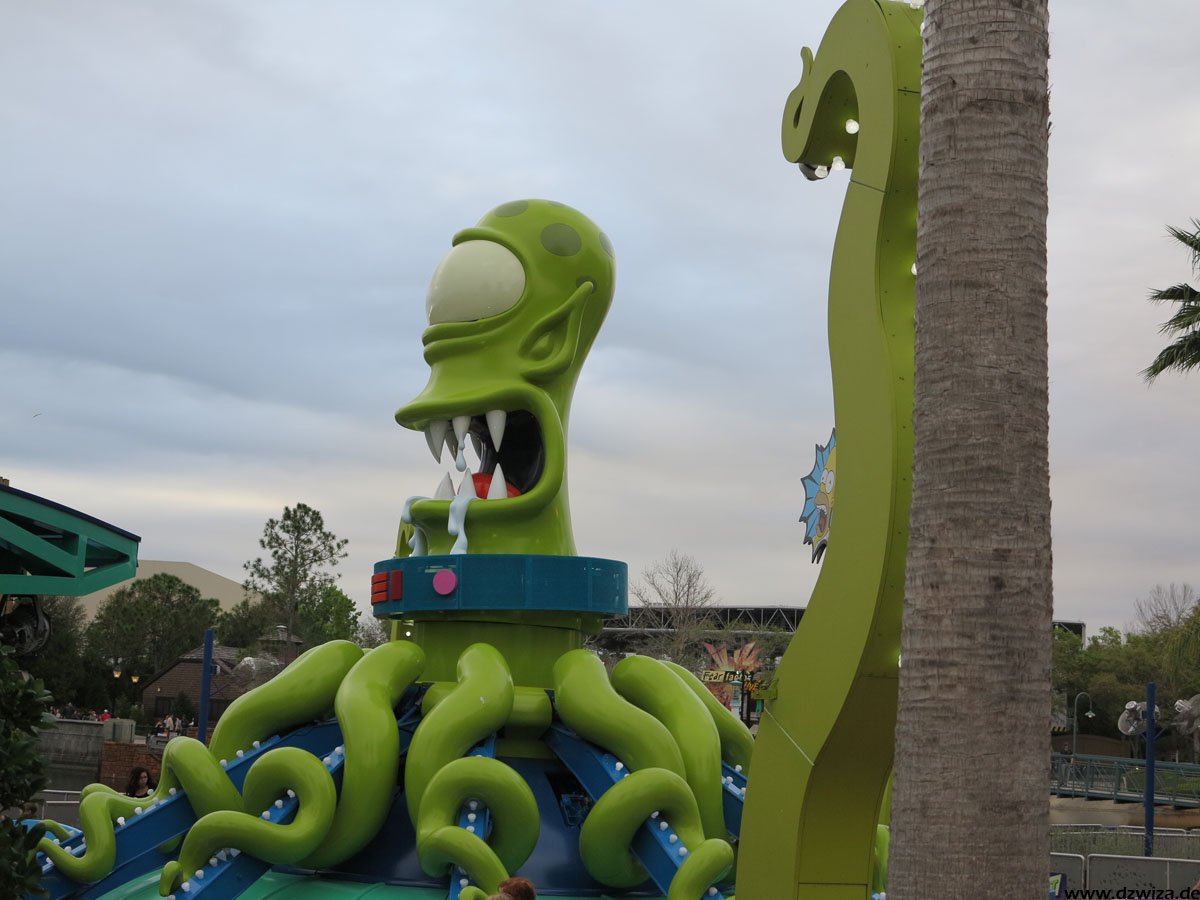 Woody Woodpeckers Kid Zone als Ecke mit mehreren kleineren Attraktionen für Kinder stelle ich hier nicht im Detail vor. Eine Großattraktion befindet sich hier allerdings auch: E.T. Adventure. Auch wenn E.T. ein riesiger Erfolg für Steven Spielberg und das ausführende Studio waren: Film und Thema sind sichtbar in die Jahre gekommen, nicht mehr jeder Gast dürfte den filmischen Hintergrund noch kennen. Und doch: Die Fahrt durch E.T. – Kulissen im schwebenden Fahrrad hat schon Stil und ist zudem absolut familientauglich. Etwas weiter am See entlang, die Straße hier heißt nun Fast Food Lane, kommen wir zum Wohnort der Simpsons. Vor einigen Jahren hat man hier den Simulator zu den „Zurück in die Zukunft“ – Filme umthematisiert und alles neu rund um die Simpsons gestaltet. Die Fahrtabläufe wurden dabei neu programmiert, der Film natürlich ausgetauscht, die Attraktion – ein klassischer Bewegungssimulator – ist aber gleich geblieben.