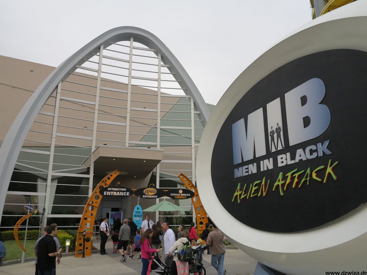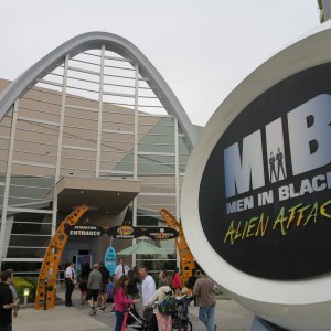 Etwas weiter statten wir den Men In Black einen Besuch ab. Alien Attack verrät schon, was uns erwartet: Natürlich müssen wir eine Invasion Außerirdischer abwehren und fahren dabei in Gondeln durch Straßenkulissen in denen wir mit „Laserpistolen“ auf die unerwünschten Gäste zielen dürfen. Solche interaktiven Darkrides sind hinlänglich bekannt. Men In Black variiert das Ganze aber: Es starten immer zwei Fahrzeuge parallel nebeneinander. Trifft man die falschen (gutmütigen) Aliens oder die Jäger im anderen Fahrzeug hat das nicht nur Einfluss auf den eigenen Punktestand, sondern auch auf das Fahrverhalten des eigenen Fahrzeugs.