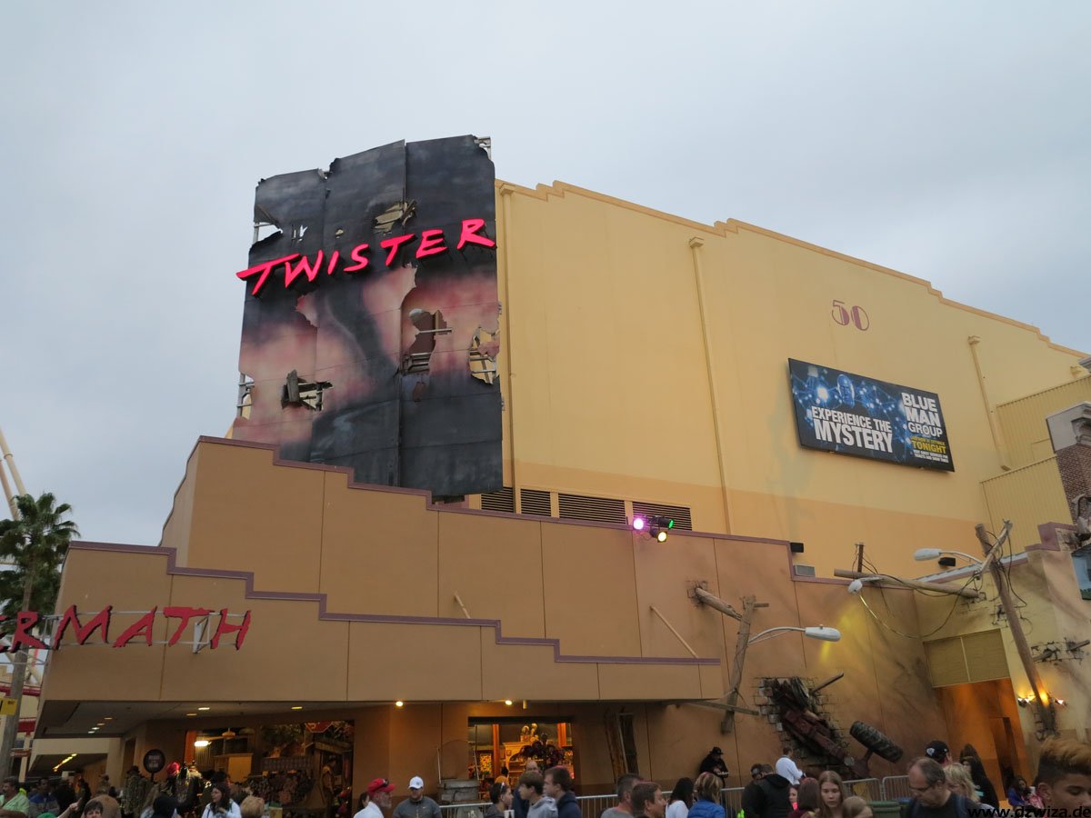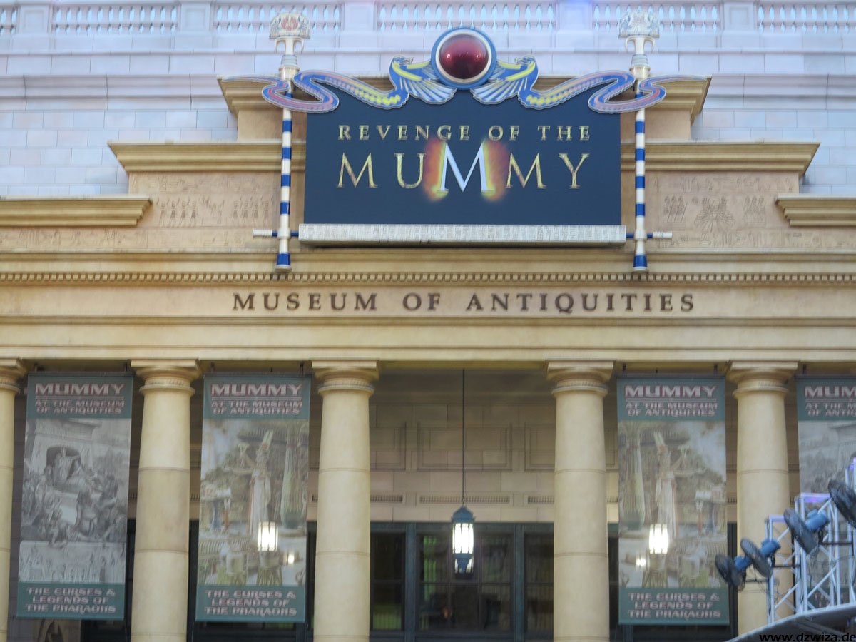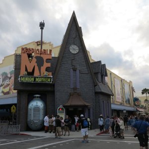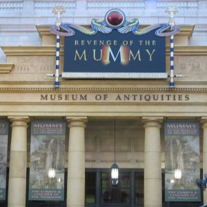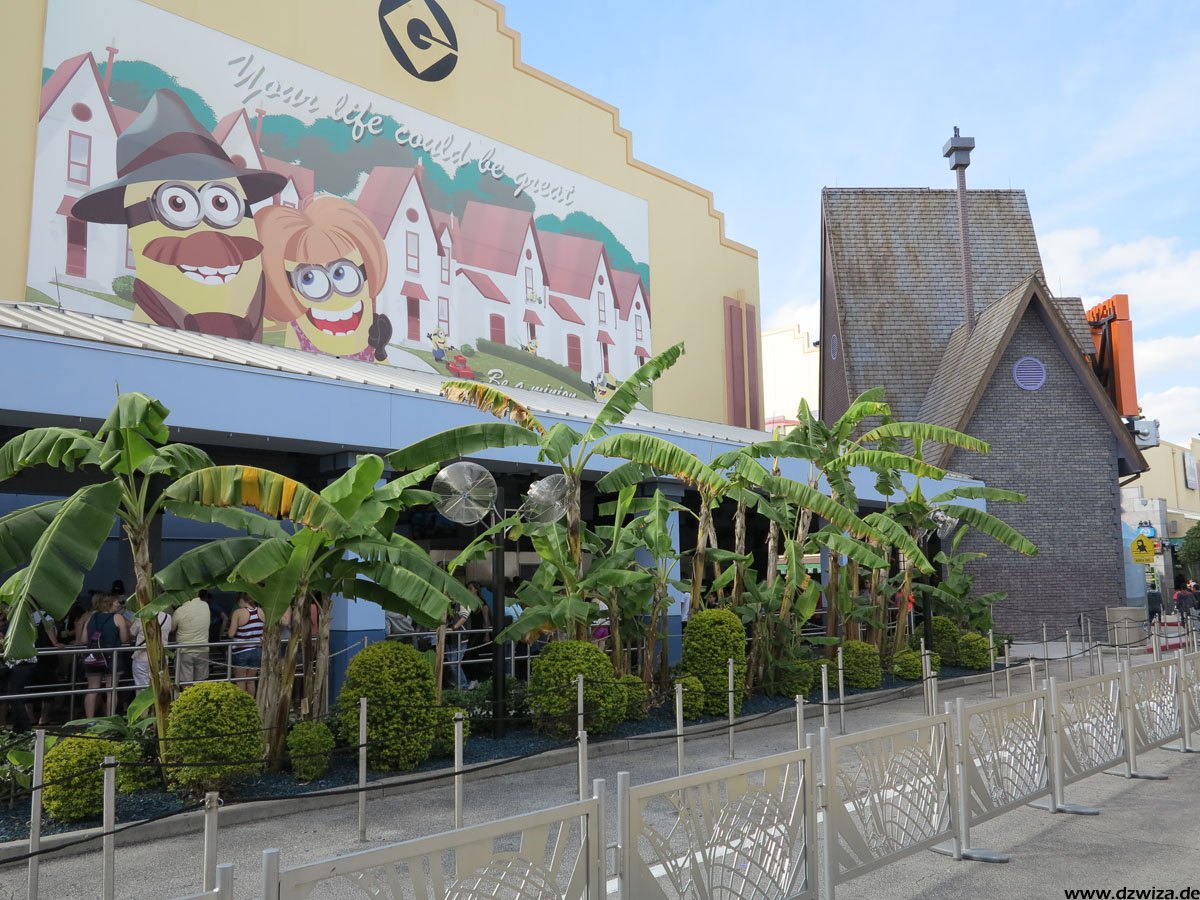 Wenn wir nun in das Labyrinth der Filmsets und kleines Gassen und Straßenzüge eintauchen, gelangen wir zu weiteren Attraktionen. Imposant ist dabei Revenge of the Mummy. Die „Mumien“-Filme waren schon früh große Universal-Hits. Diese Attraktion ist natürlich an die Neuauflage angelehnt. Bereits die Gestaltung des Wartebereiches als Museum, Filmset, Tempel und Katakomben ist beeindruckend. Bei der Fahrt handelt es sich um eine Achterbahn mit zahlreichen Spezialeffekten, deren Details selbstverständlich nicht näher verraten werden. Zur Eröffnung der Studios geisterte hier übrigens nicht die Mumie durch die Kulissen, der Besucher sah sich vielmehr mit King Kong konfrontiert. Ein paar kleine Attraktionen gibt es in diesem Bereich: Twister erlaubt es, einen Wirbelsturm hautnah zu erleben. Shrek 4-D ist ein 4D-Film und Despicable Me: Minion Mayhem findet sich zwar in einem kleinen, unscheinbaren Gebäude, ist aber eine sehr beliebte Attraktionen mit sehr langen Wartezeiten: Ein 3D-Film auf einer sich leicht bewegenden Plattform, bei der neuen Minions rekrutiert werden sollen – natürlich die Besucher. Wie immer lohnt auch hier ein Blick auf die Details: Die Bepflanzung am Gebäude besteht aus Bananenstauden. Das Gebäude hatte früher übrigens Attraktionen zu den Cartoons von Hanna-Barbera und später zu Jimmy Neutron, bevor die Minions einzogen.