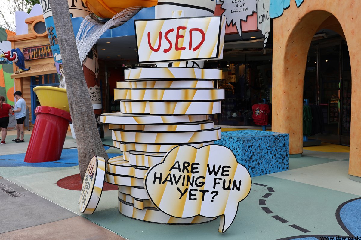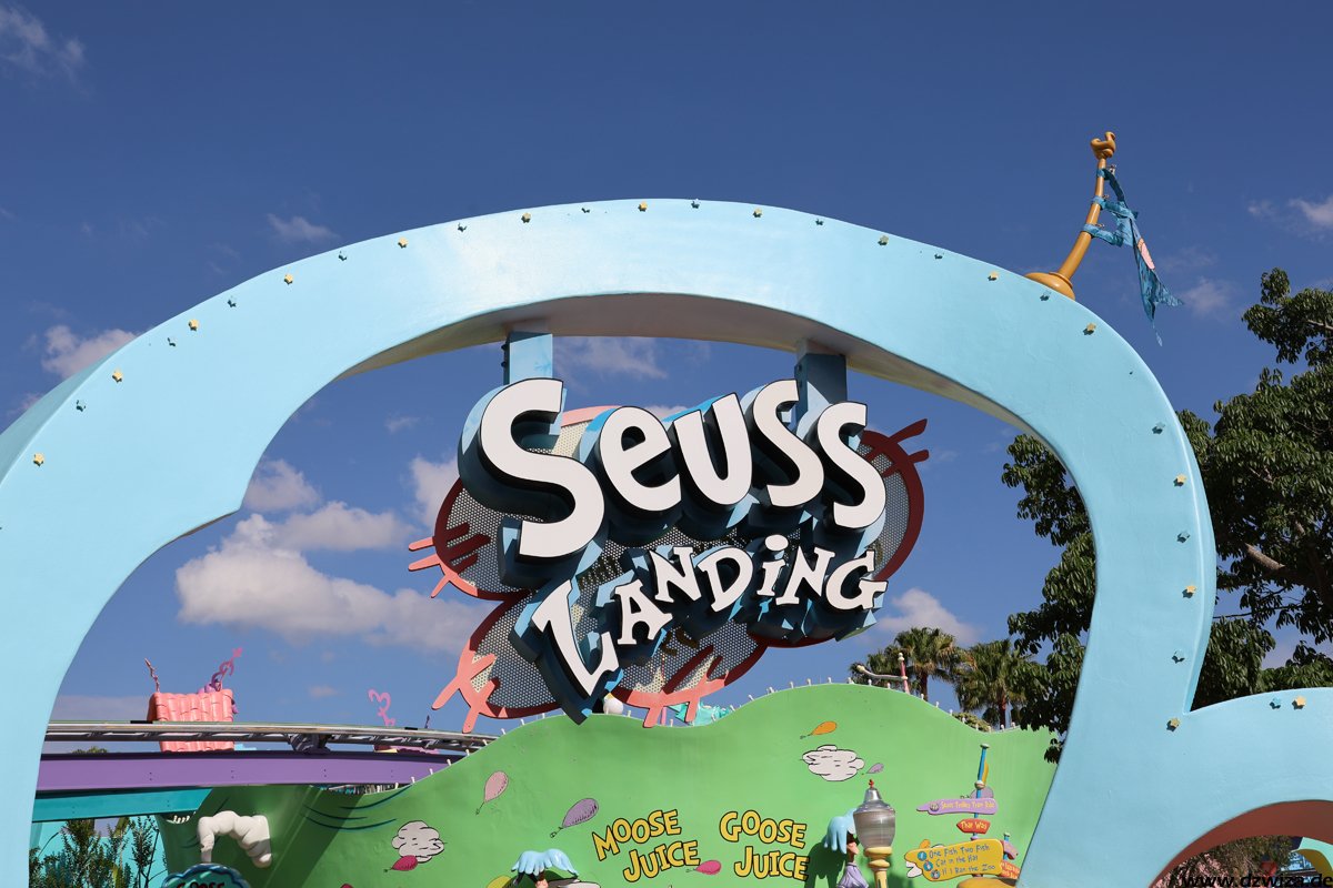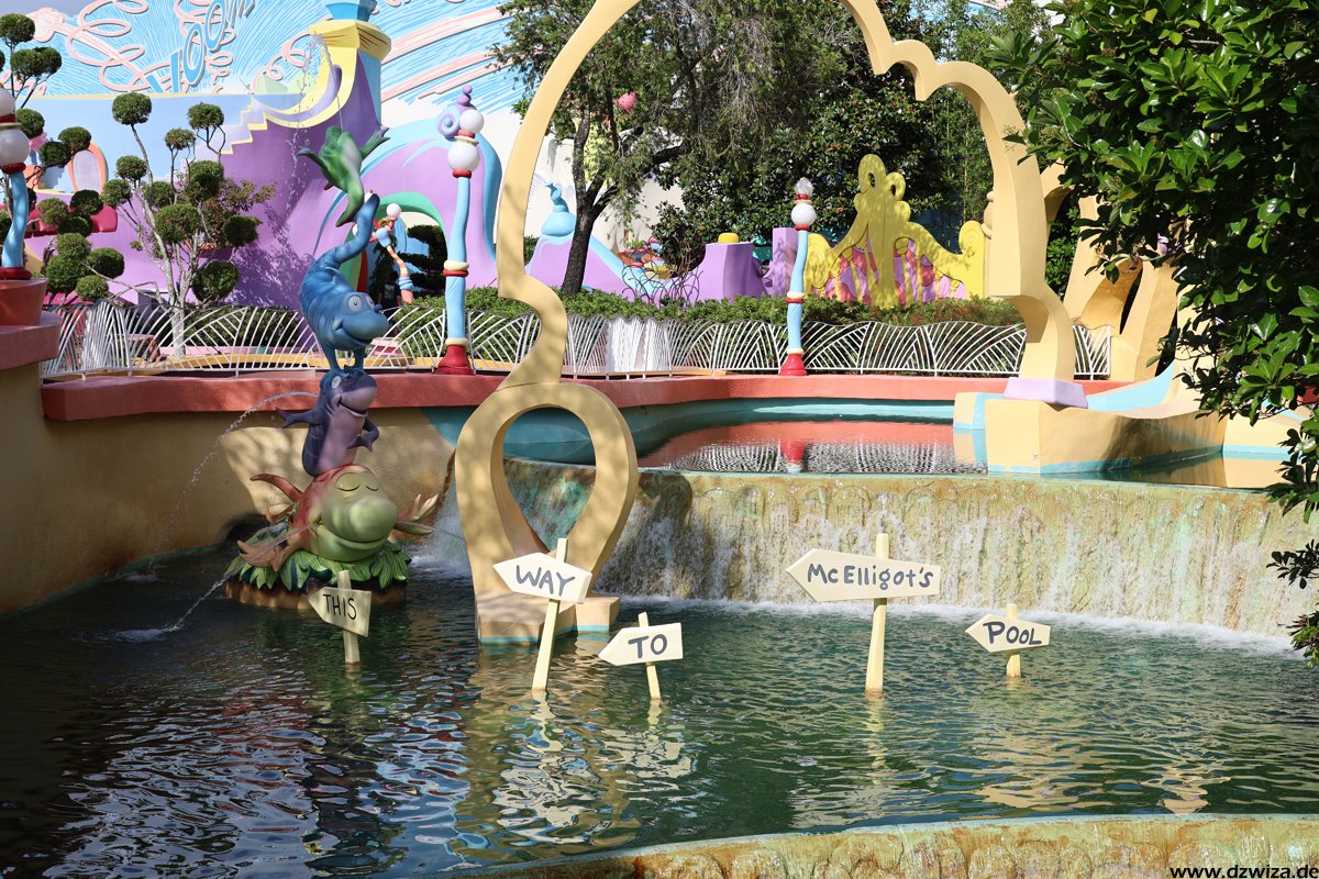 Seuss Landing ist der erste Bereich und schnell abgehandelt: Das ist der Kinderbereich im Park. Die Thematisierung zu den Charakteren aus der „Dr. Seuss“ – Welt ist für uns jetzt nicht ganz so gängig, da diese hierzulande weniger bekannt sind. Auf jeden Fall ist es damit aber ein Thema, das nicht ganz so abgelutscht ist, wie in manch anderem Kinderbereich. Warnen muss man lediglich vor der Hochbahn „The High in the Sky Seuss Trolley Train Ride“: Selbst bei sehr kurz aussehenden Warteschlangen dauert es ewig. Das Tempo der Warteschlange ist einfach unfassbar langsam.
