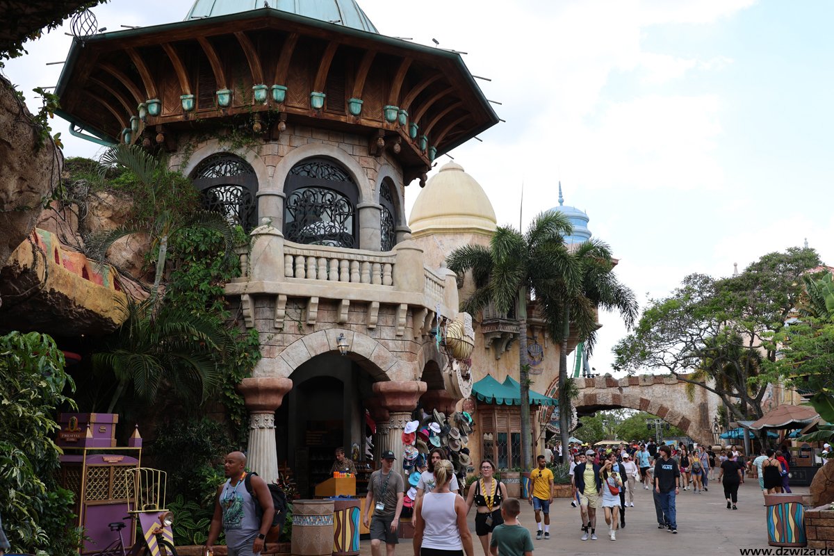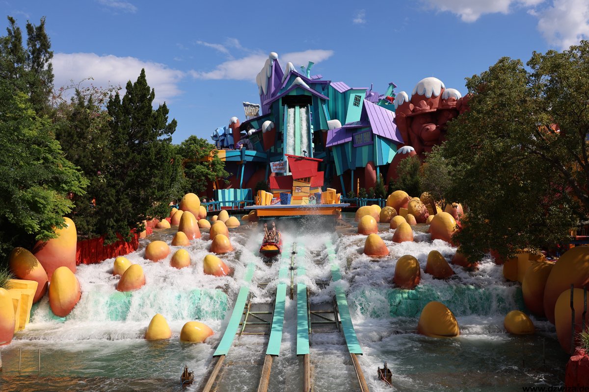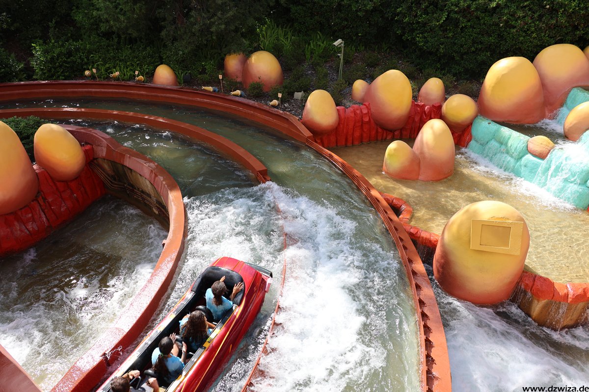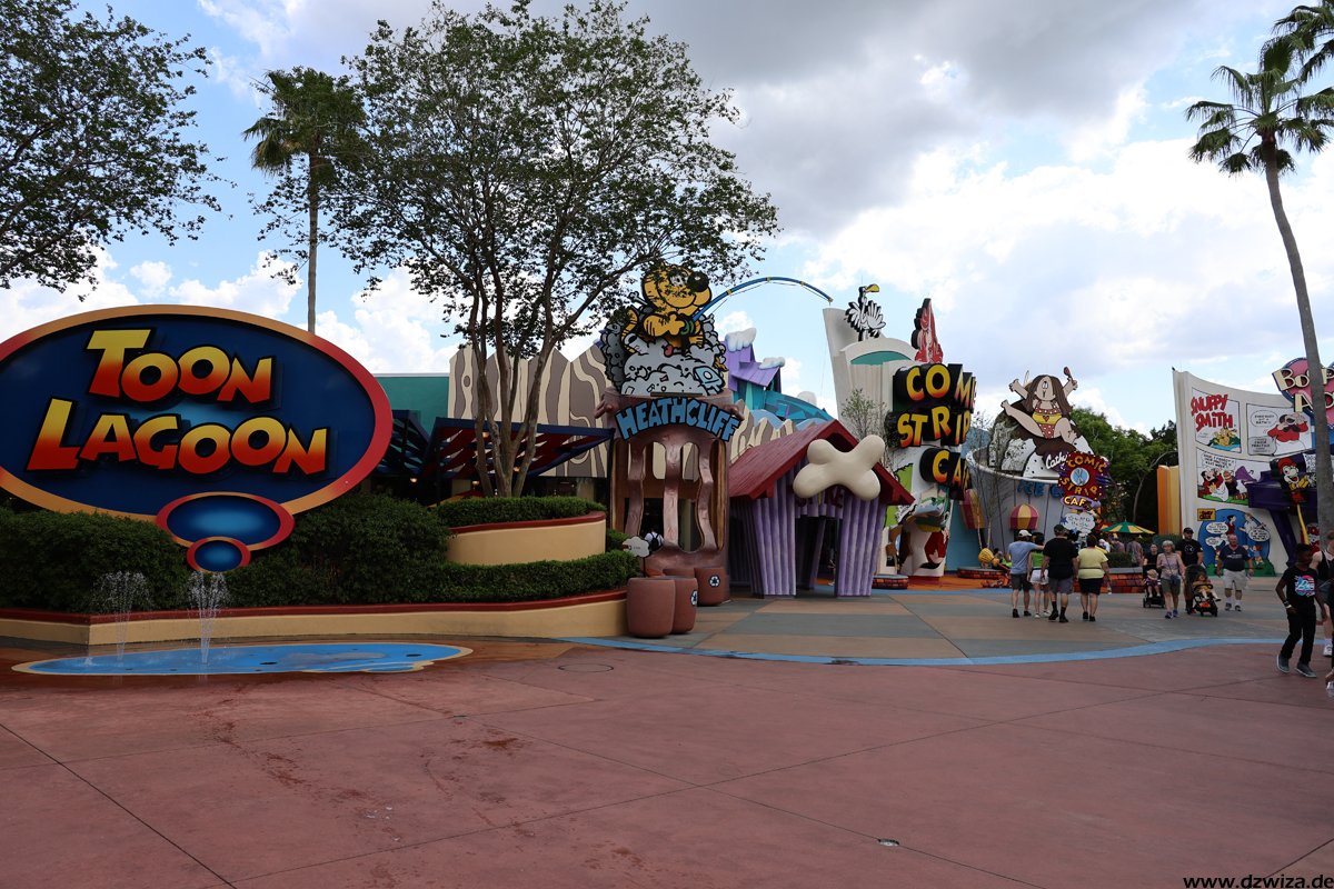 Seuss Landing ist der erste Bereich und schnell abgehandelt: Das ist der Kinderbereich im Park. Die Thematisierung zu den Charakteren aus der „Dr. Seuss“ – Welt ist für uns jetzt nicht ganz so gängig, da diese hierzulande weniger bekannt sind. Auf jeden Fall ist es damit aber ein Thema, das nicht ganz so abgelutscht ist, wie in manch anderem Kinderbereich. Warnen muss man lediglich vor der Hochbahn „The High in the Sky Seuss Trolley Train Ride“: Selbst bei sehr kurz aussehenden Warteschlangen dauert es ewig. Das Tempo der Warteschlange ist einfach unfassbar langsam.