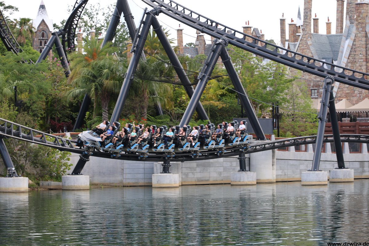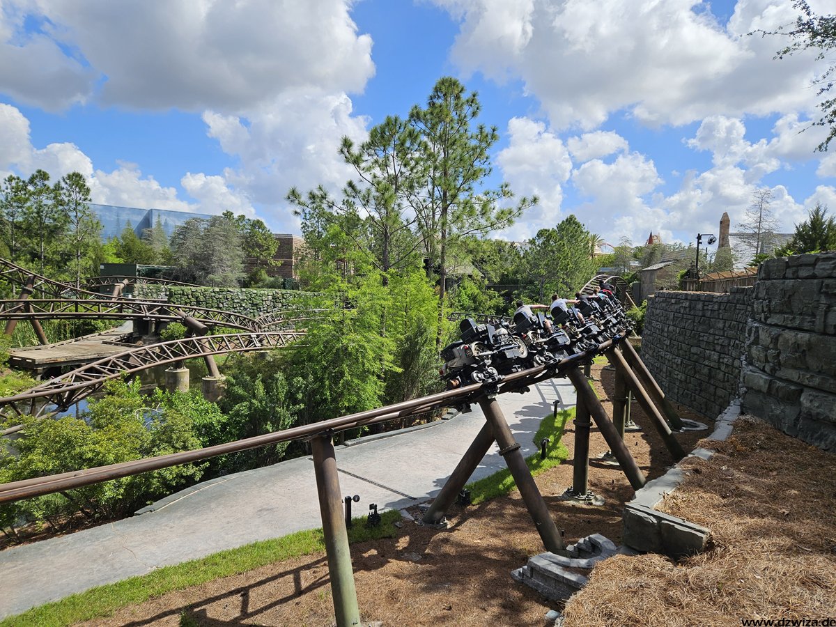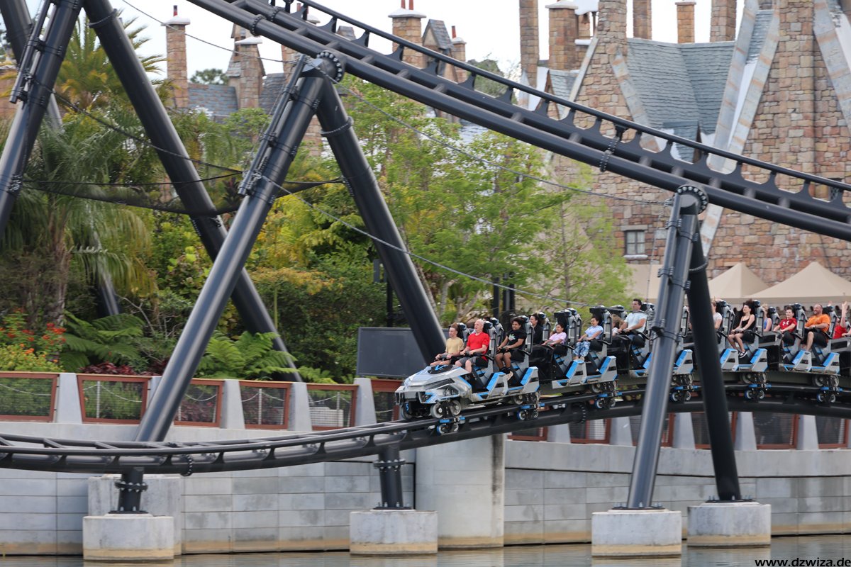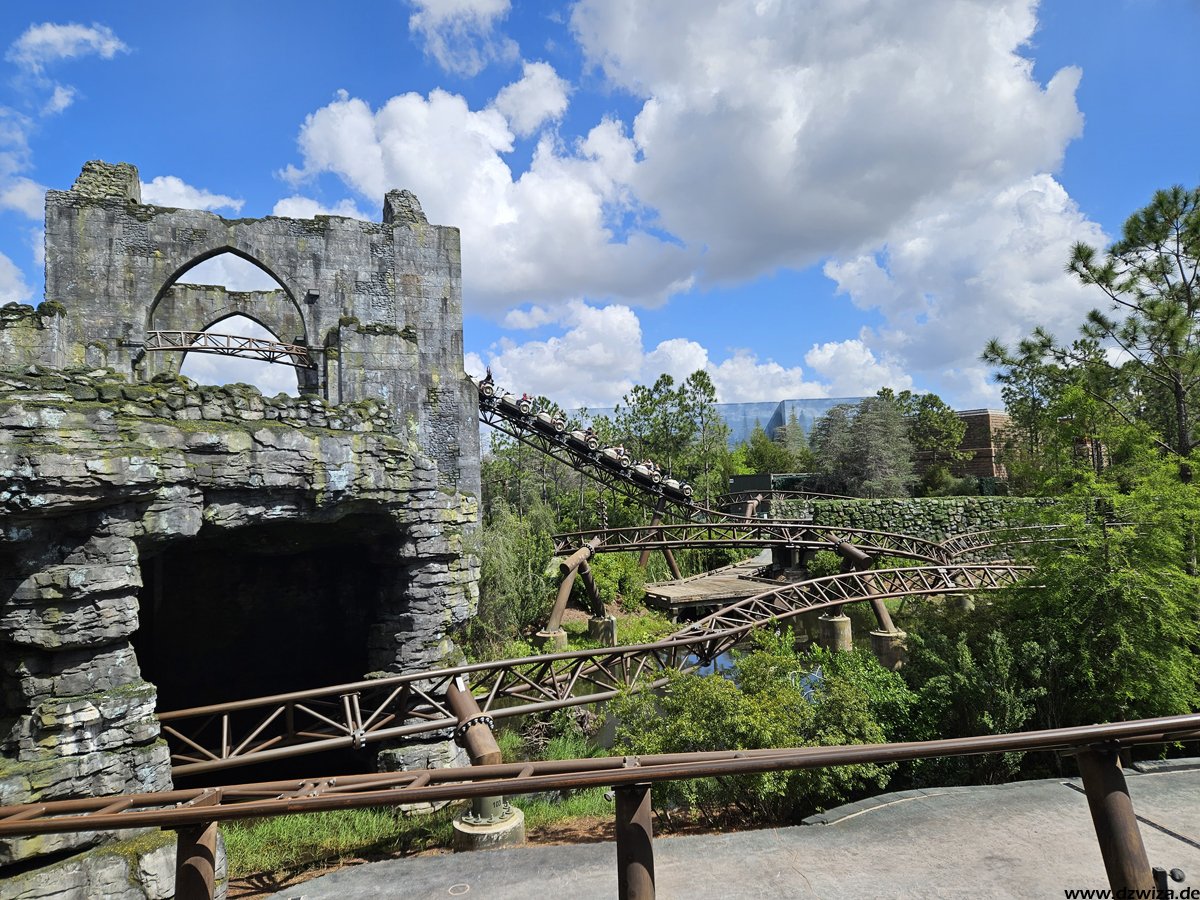 In diesem Teil geht es nach Hogsmeade. Ich glaube, nach so vielen Jahren muss man nicht mehr viele Worte verlieren. Der Themenbereich ist immer noch Spitzenklasse im Bereich der Immersion. Forbitten Journey, die Kuka-Fahrt, ist für mich ein absolutes Highlight. Dies und natürlich auch Hagrid will man gar nicht zu sehr im Detail beschreiben, um die Spoilergefahr nicht zu hoch zu setzen. Bei der Journey ist die ganze Warteschlange sehr gut gemachter Teil der Attraktion. Es gibt eine Single-Rider-Line, die sehr kurz ist und bei der man meist sehr schnell zu einer Fahrt kommt, aber fast die ganze Themenshow überspringt. Also besser erst ab Fahrt Nr. 2 nutzen. Bei Hagrid hatte temporär eine vorher nicht angekündigte Single-Rider-Line offen, die aber keinerlei Zeitgewinn brachte, überwiegend in der heißen Sonne vor der Burg stand (im wörtlichen Sinne) und an den Showelementen der regulären Queue vorbeiführte. Die Position auf dem Motorrad fand ich spannender als im Beiwagen. Fahren muss man natürlich beides.
