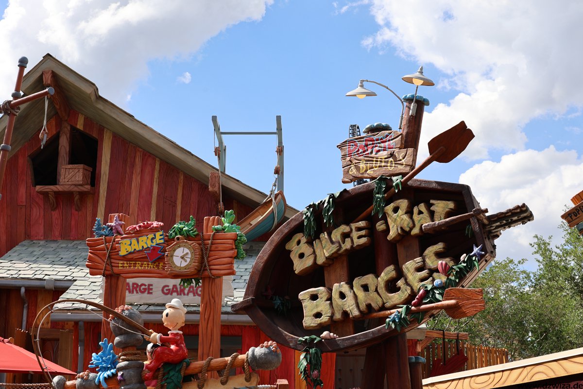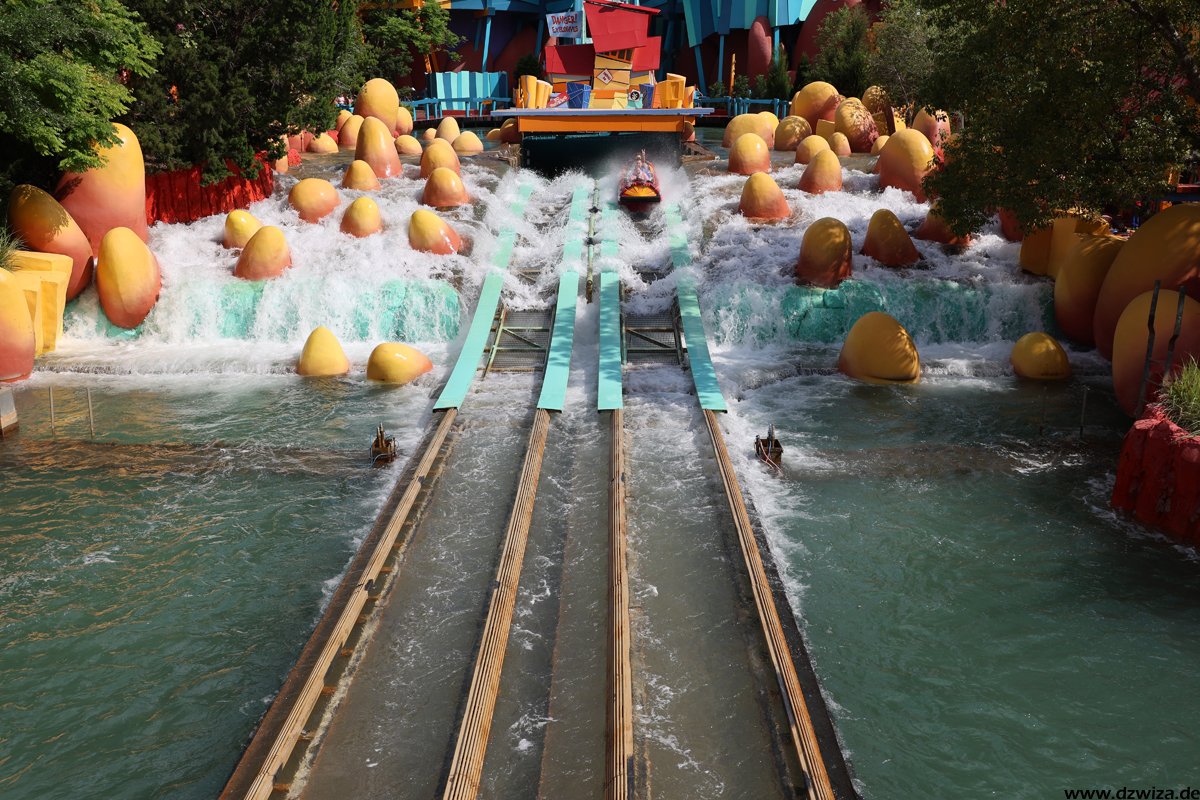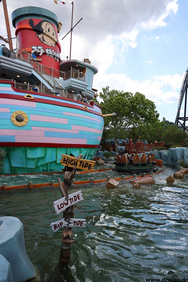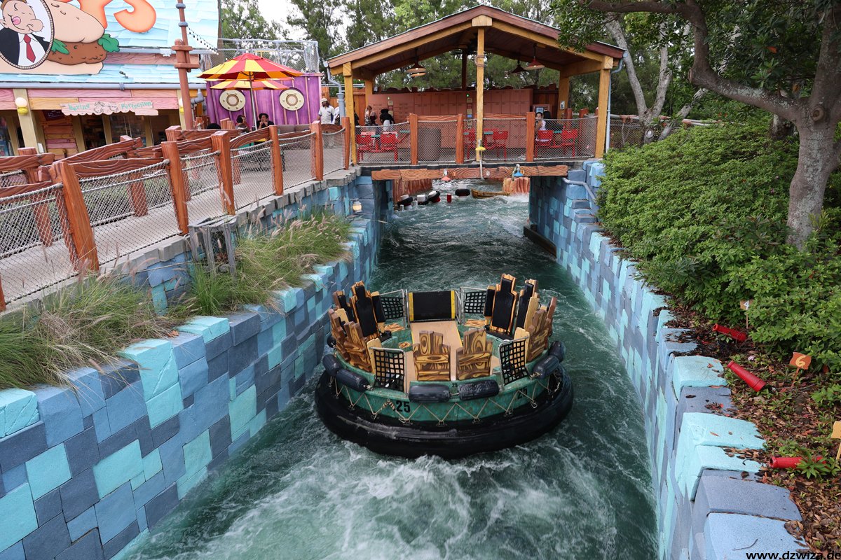 Die Wasserecke. Während mir Dudley Do-Rights Ripsaw Falls (heißt wirklich so kompliziert) nicht ganz so gefällt, weil ich die Boote mit ihren Bügeln einfach sehr unbequem finde (die Fahrt selbst ist völlig i.o.), ist Popeye & Blutos Bilge-Rat Barges mein absoluter Favorit unter den Rafting-Rides. Ich kenne keine andere Fahrt, die einen dermaßen konsequent nass macht. Fährt man auf einen Wasservorhang zu, würde in jedem anderen Ride der Vorhang kurz vor erreichen abgeschaltet werden. Hier gilt eher: Wird weiter aufgedreht. Und erreicht man erst mal den Lifthill, um sich vermeindtlich auszuruhen, erkennt man schnell, dass die Boote ja auch irgendwann geputzt werden müssen. Grandioser Gag. Und: Durchnässt sofort wieder anstellen.