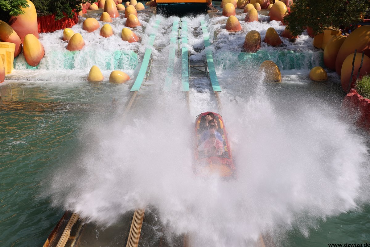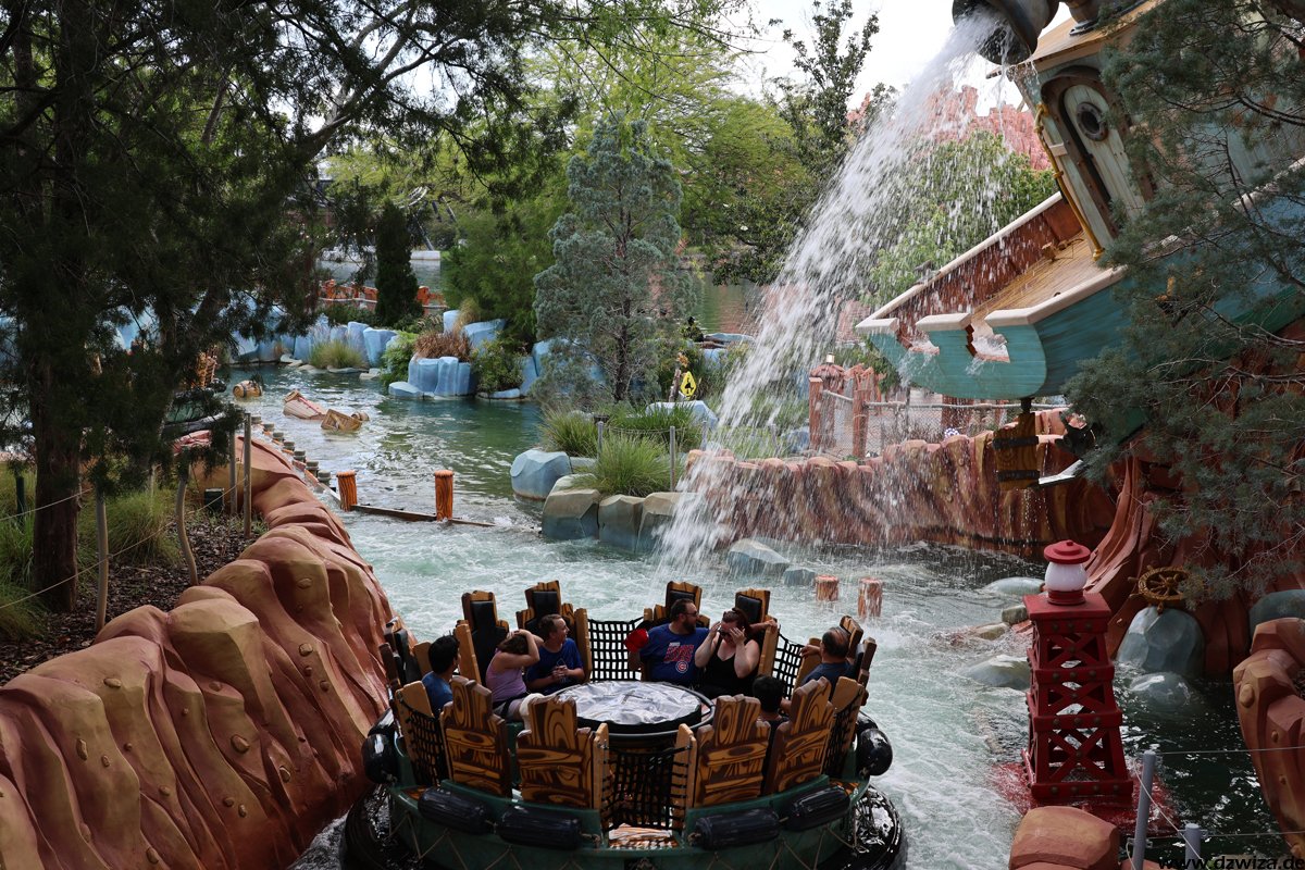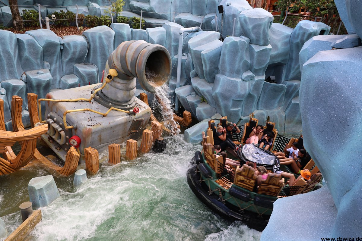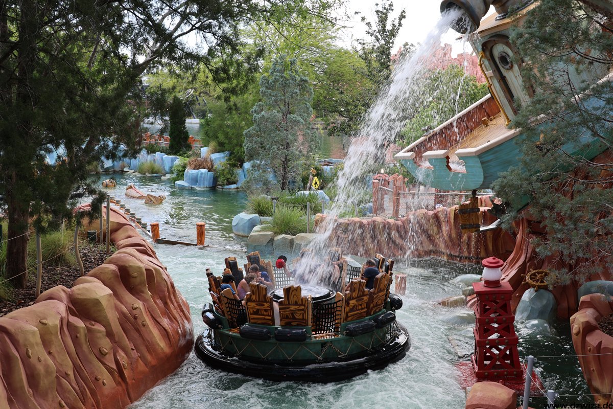 Die Wasserecke. Während mir Dudley Do-Rights Ripsaw Falls (heißt wirklich so kompliziert) nicht ganz so gefällt, weil ich die Boote mit ihren Bügeln einfach sehr unbequem finde (die Fahrt selbst ist völlig i.o.), ist Popeye & Blutos Bilge-Rat Barges mein absoluter Favorit unter den Rafting-Rides. Ich kenne keine andere Fahrt, die einen dermaßen konsequent nass macht. Fährt man auf einen Wasservorhang zu, würde in jedem anderen Ride der Vorhang kurz vor erreichen abgeschaltet werden. Hier gilt eher: Wird weiter aufgedreht. Und erreicht man erst mal den Lifthill, um sich vermeindtlich auszuruhen, erkennt man schnell, dass die Boote ja auch irgendwann geputzt werden müssen. Grandioser Gag. Und: Durchnässt sofort wieder anstellen.