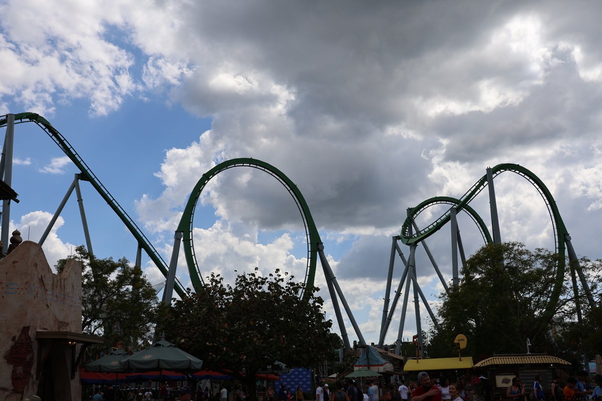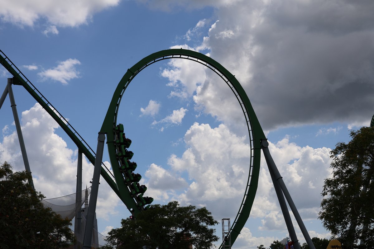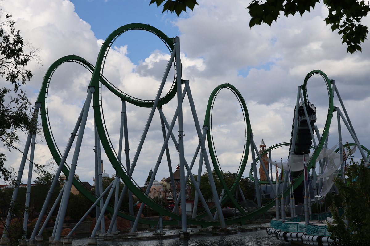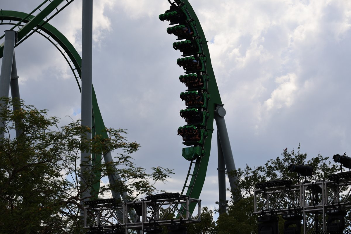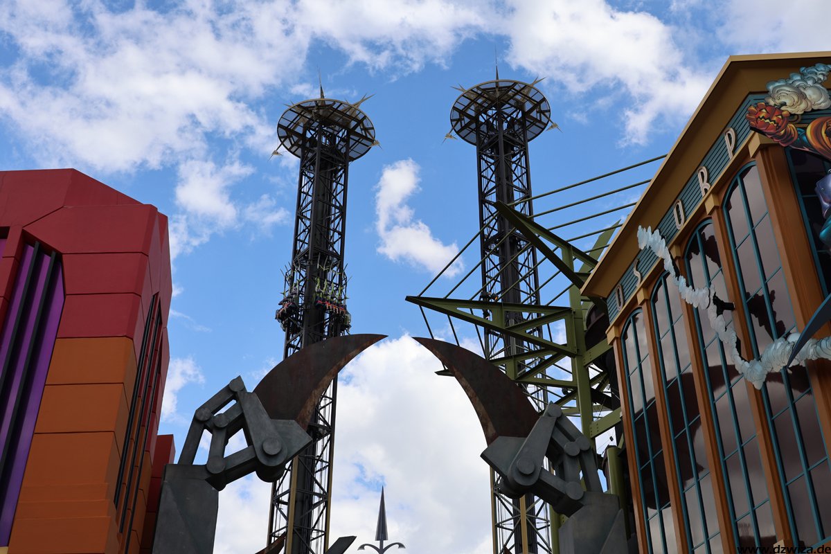 Klar, hier steht Hulk, die grüne Kraftschleuder. Viele Worte gibt es dazu nicht zu verlieren. Kurz nach meinem letzten Besuch wurde die komplett abgebaut, überarbeitet und neu wieder aufgebaut. Das ist schon wieder ein paar Jahre her, sie fährt sich immer noch sehr beeindruckend. Nebenan die beiden Freefall-Türme mit sehr langsam voranschreitenden Warteschlangen. Besser den Single-Rider-Eingang nehmen. Und Superman ist ja im Prinzip zweimal da: Als „Transformers“ ist sehr nämlicher Form noch mal im Nachbarpark.