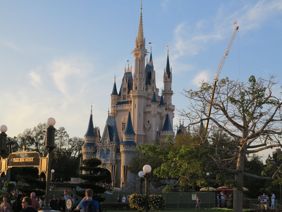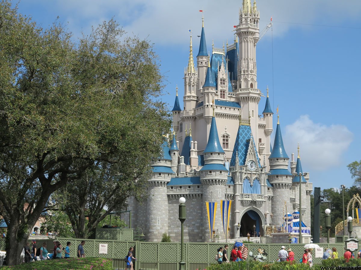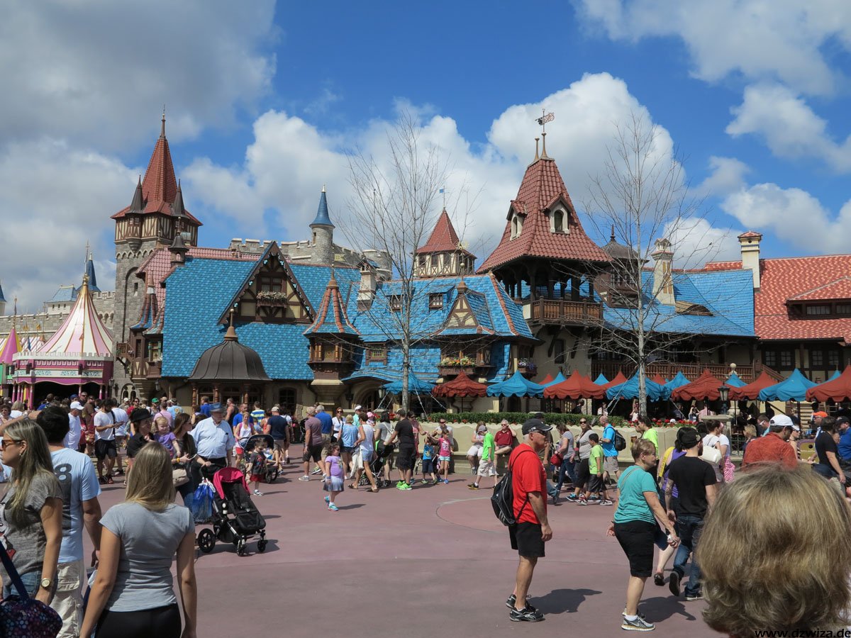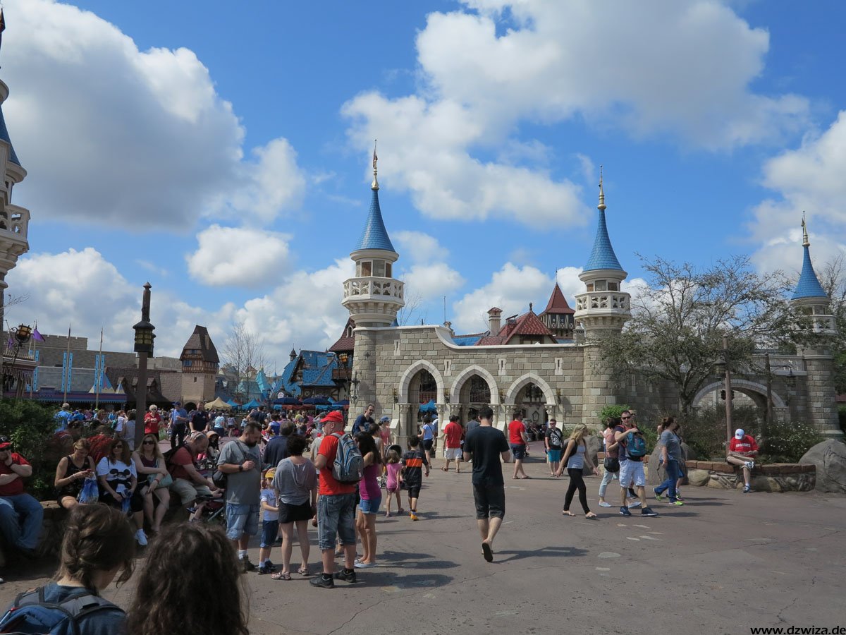 Beginnen wir mit dem Rundgang auf der Main Street: Hier dominieren Geschäfte, Kulissen und Street Entertainment. Die Main Street führt zu dem schon erwähnten zentralen Platz, wo sich alles auf die verschiedenen Bereiche verteilt: Direkt vor dem großen Schloss, dass wohl wirklich jeder kennt: Cinderellas Castle.