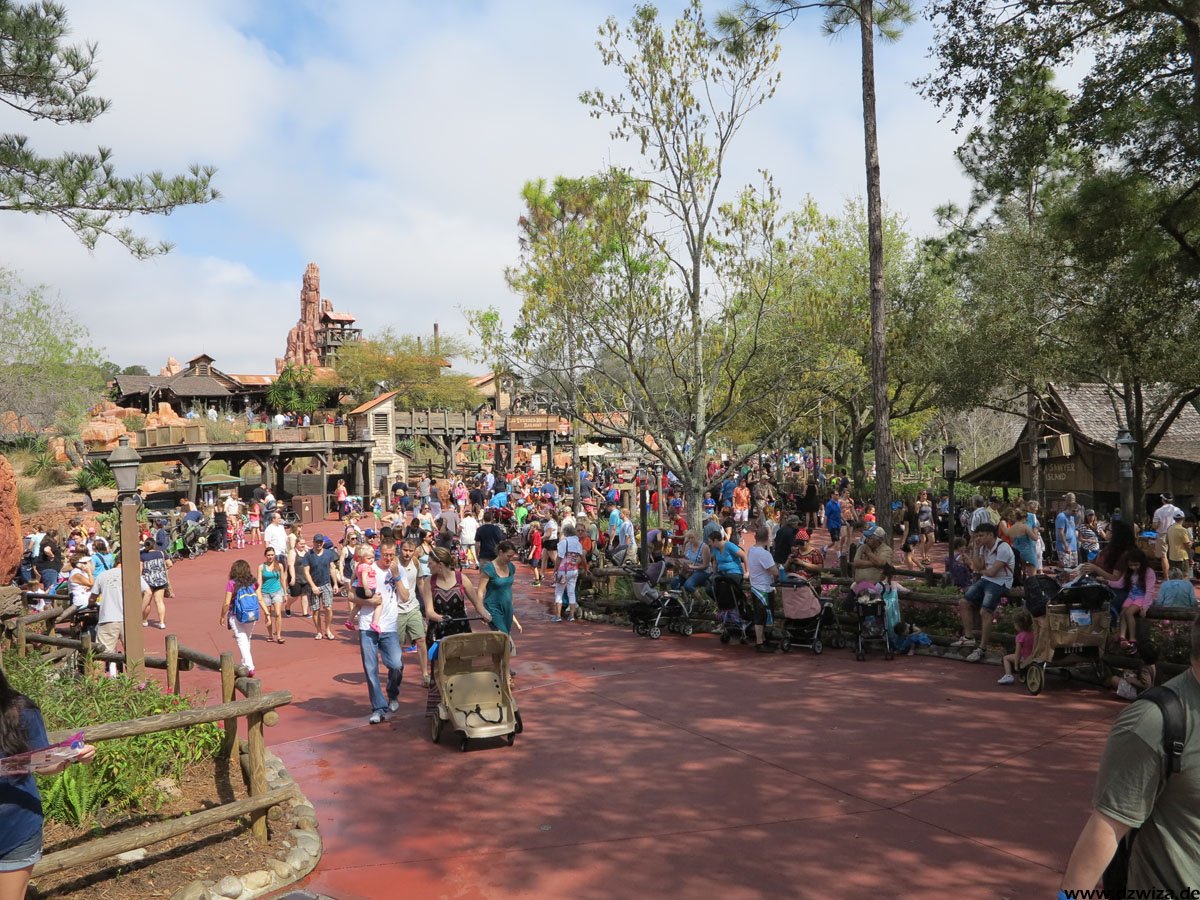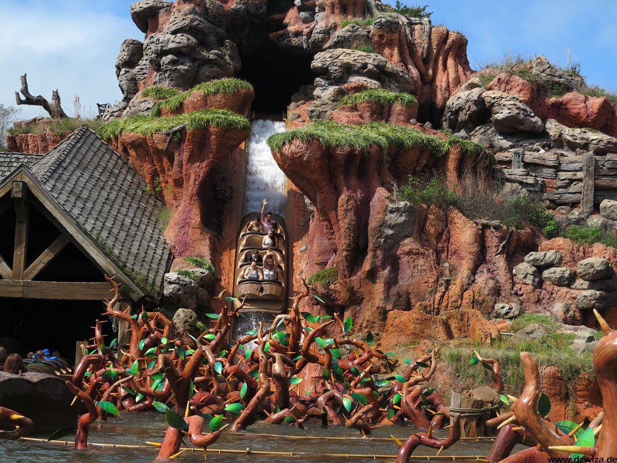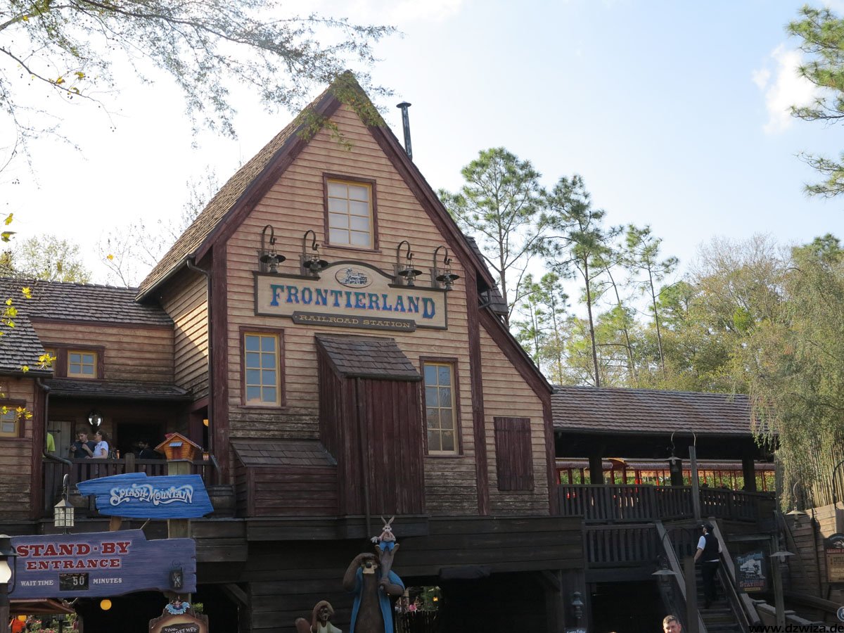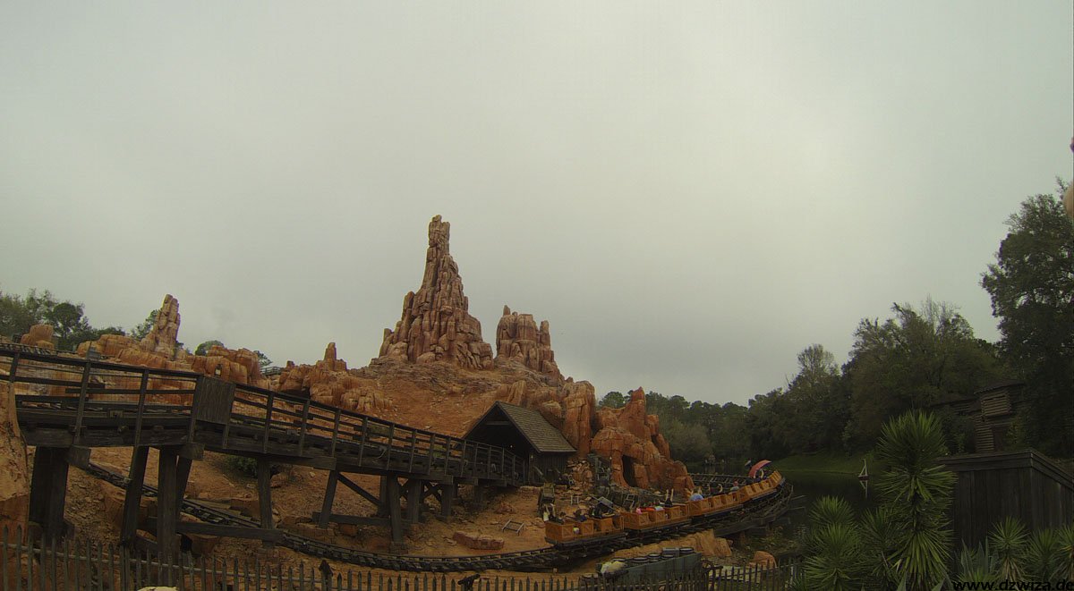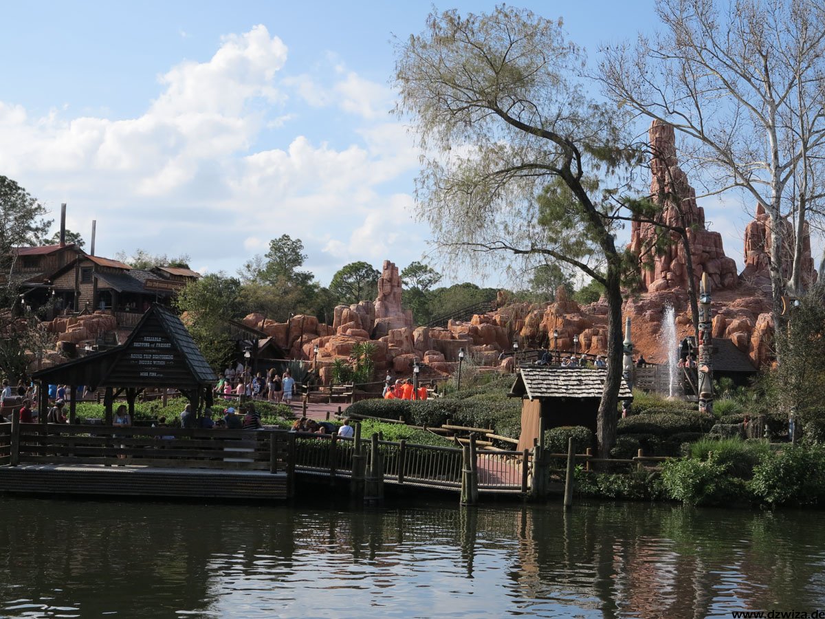Im angrenzenden Frontierland wird es nass: Splash Mountain ist die dortige Wildwasserbahn, die eine sehr detaillierte thematische Gestaltung hat. Der letzte große Sturz ist der einzige Fahrabschnitt, der einsehbar ist und durchaus reichlich nass daherkommt. Mit kleinen Fähren kommt man auf Tom Sawyers Island, einer Insel, die man zu Fuß erkunden kann. Hier ist es meist etwas ruhiger. Gut, um mal ein paar Minuten abzuschalten. Und dann ist das noch die zweite große Hauptattraktion: Big Thunder Mountain Railroad. Eine Achterbahn von sehr großen Ausmaßen in Bezug auf die verbaute Fläche. Die Fahrt selbst ist absolut familientauglich.