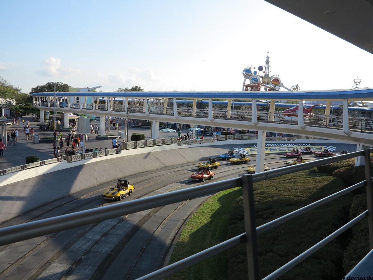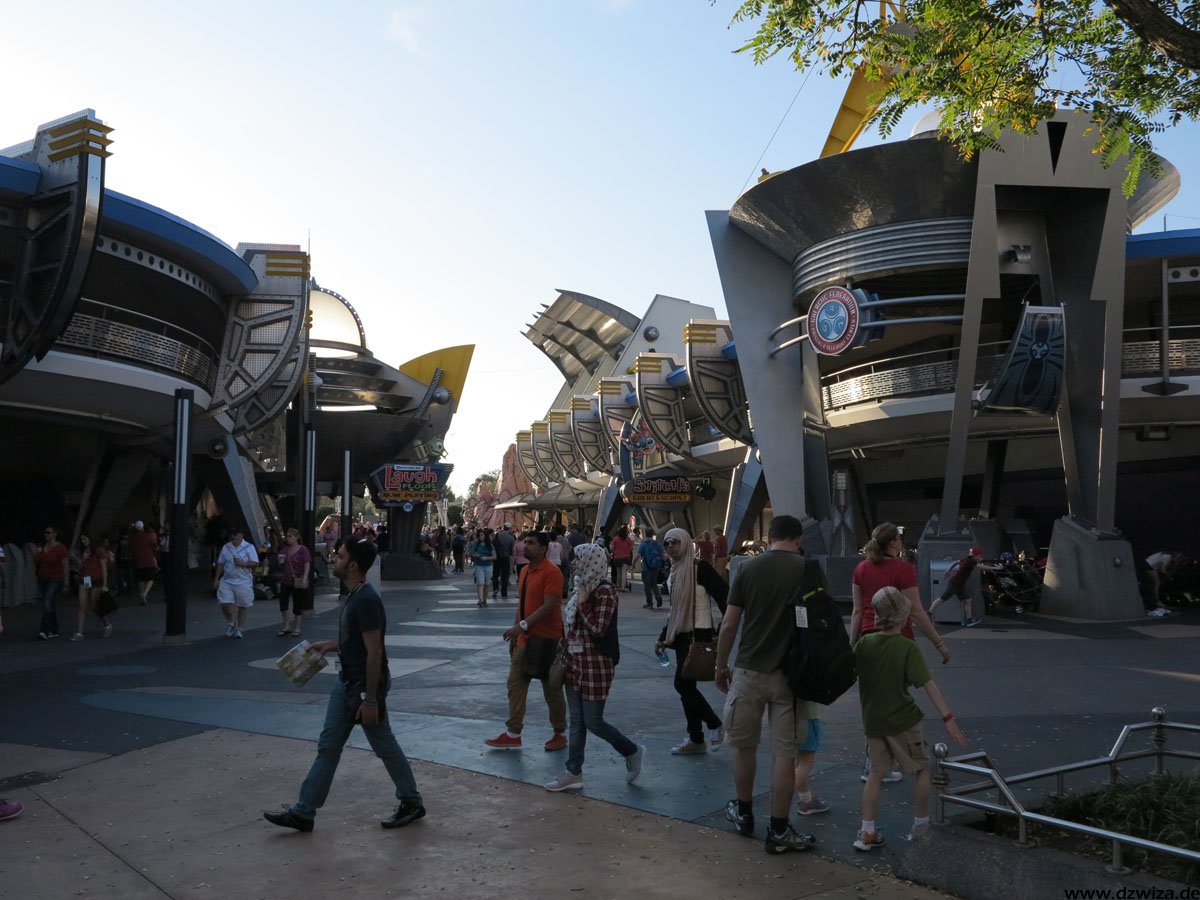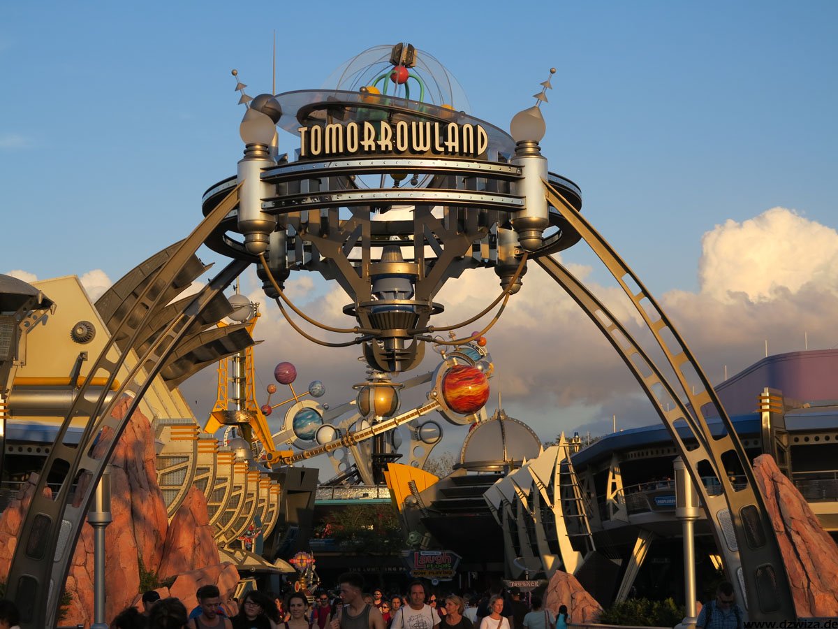 Bleibt noch das Tomorrowland: Hier wird die Zukunft gezeigt - was schnell das Problem aufwerfen könnte, dass die Realität die Zukunft einholt. Daher hat man sich auf die Darstellung einer Zukunft konzentiert, wie man sie sich in der ersten Hälfte des 20. Jahrhunderts vorgestellt hat. Auf jeden Fall gibt es hier eine ziemlich bunte Mischung: Buzz Lightyears Space Rangers Spin: Eine interaktive Fahrt, in der man mit Laserkanonen in der Welt des Buzz Lightyear aufräumen darf. Space Mountain ist etwas ganz anderes als die Achterbahn, die vielleicht der eine oder andere Leser hier aus Paris kennt: Kein Abschuss, kein Looping, eher eine Fahrt im dunkeln, die mit einer Wilden Maus mit ihren Haarnadelkurven vergleichbar ist. Innerhalb des Magic Kingdom ist es die "erwachsenste Achterbahn". Stitchs Great Escape! ist eine Show mit viel Sound- und Lichteffekten, die auf wohldosierte Schreckmomente setzt. So kann es passieren, dass einem da mal plötzlich ein Alien in den Nacken hustet oder auf die Schulter greift. Tomorrowland Speedway ist eine Autofahrt auf einer Rennpiste und der PeopleMover eine entspannte Rundfahrt. Neben den hier erwähnten Attraktionen gibt es noch zahlreiche Shows.