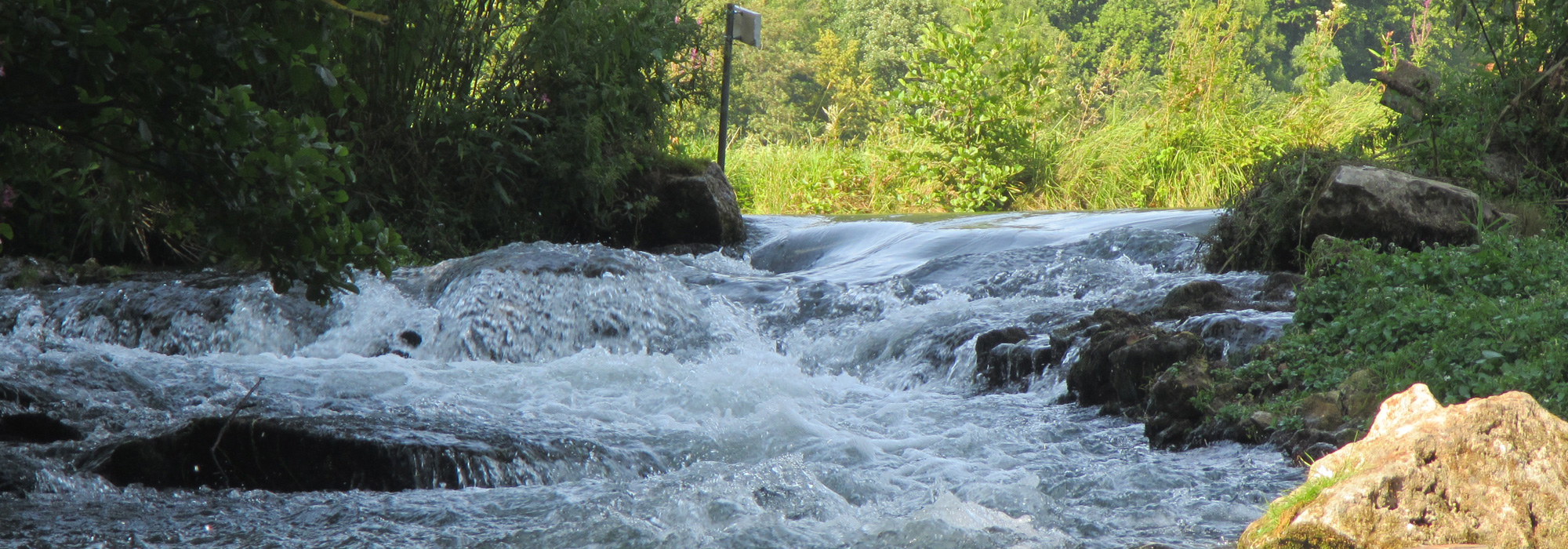 Kurz nach der Einsetzstelle verläuft quer durch den Fluss eine Spundwand. Man hält sich sehr weit links und kann dann daran vorbeipaddeln. Rechts geht es nicht weiter, in der Mitte lauern die ersten Kentersteine. Flott geht es um eine Linkskurve in einen langgestreckten Schwall. Der endet nach einer Rechtskurve. Hier hält man sich wieder am linken oder rechten Ufer, in der Mitte ist ein großer, bei gutem Wasserstand weit überspülter und spät zu entdeckender Felsen.