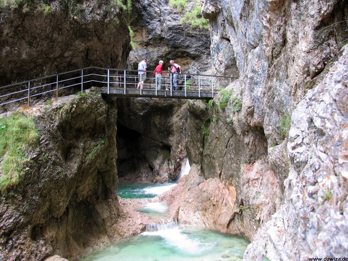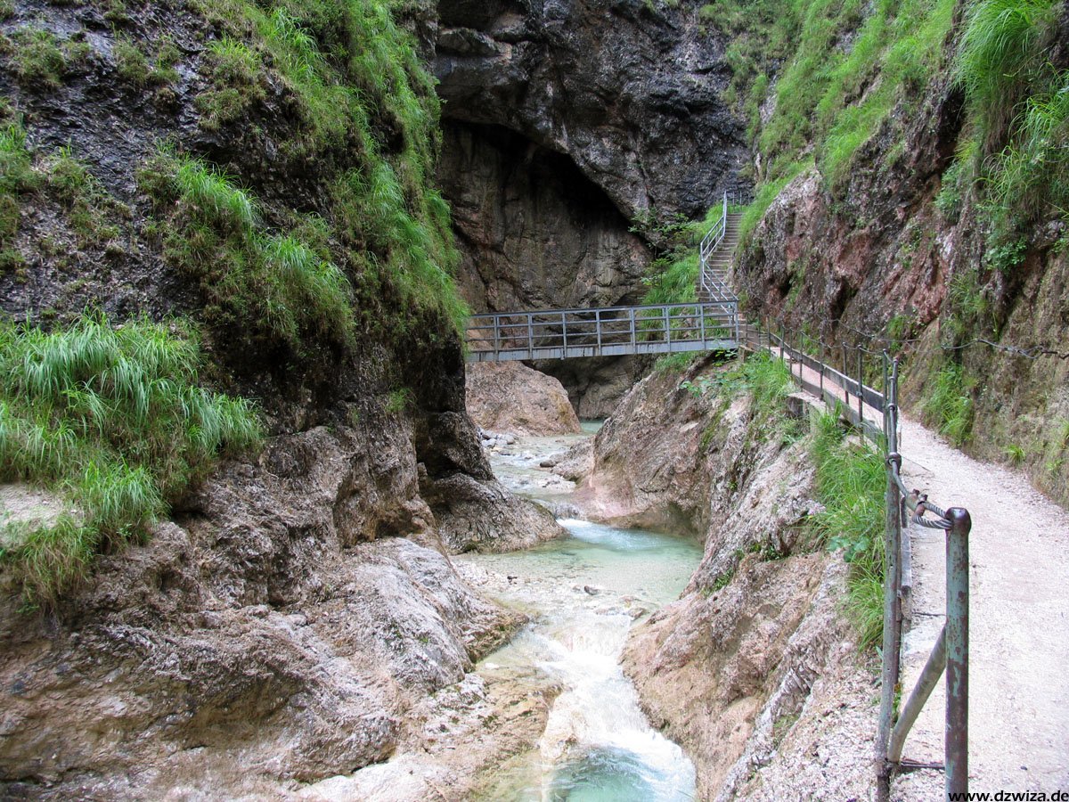 Wenn man Berchtesgaden in Richtung des ausgeschilderten Besucherbergwerkes verlässt und auf der Hauptstraße noch ein paar Kilometer weiterfährt, führt der Weg vorbei an einer Enzianbrennerei zur Einfahrt auf einem großen Parkplatz vor einem Gasthof. Hier beginnt die Wanderung durch die Almbachklamm. Der Ausgangspunkt ist auch per Linienbus, wenn er denn fährt, gut zu erreichen.
