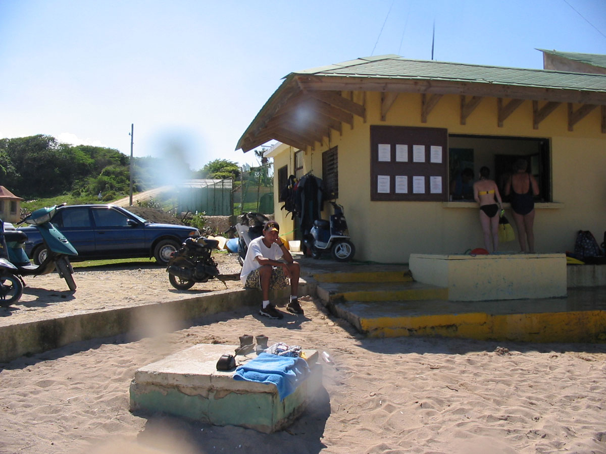 Die Tauchbasis teilt sich ein Gebäude mit dem All-Inclusive-Strandbistro des angrenzenden Hotels. Der Kompressorraum der Basis und die Küche des Bistros liegen Wand an Wand. Vor der Basis befindet sich noch ein kleines Spülbecken, dass gelegentlich auch mal als Badewanne für Tauchguides dienen muss. Gut, dass auf Badezusätze verzichtet wird.