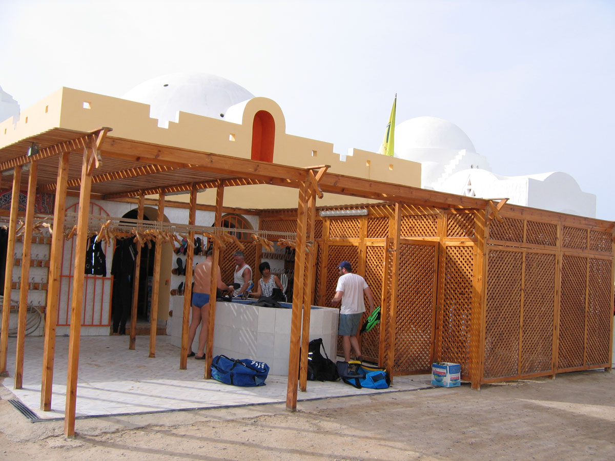 Zum Reinigen der Tauchausrüstung stehen zwei Spülbecken für "das Grobe" und zwei kleinere Becken für Automaten und Masken bereit. Neben einem Ausrüstungsraum zum Lagern von Taschen, der Abends und in der Mittagspause verschlossen wird, ist eine umfangreiche Installation zum Trocken der Ausrüstung vorhanden. Die Ausrüstung bleibt im Regelfall während des Tauchurlaubs auf den Booten (bzgl. in einem neu gebauten verschließbaren Verschlag am Bootsanleger) und wird nur beim Wechsel von Ganz- auf Halbtagesfahrten (oder umgekehrt), bei Tauchgängen am Hausriff oder Tagen mit Tauchpause zur Basis mit zurückgenommen. Der Transport erfolgt dabei immer mit den basiseigenen Pickups. Ausrüstungsschlepperei, auch wenn individueller Bedarf an einer "Zwischendurchspülung" besteht, entfällt damit. Üblicherweise werden die eigenen Taschen verwendet. Wer vermeiden möchte, dass diese durch die Mengen an Salzwasser zu sehr versiffen, kann auf die beim Check-In offensiv angebotenen Leihtaschen der Basis zurückgreifen.