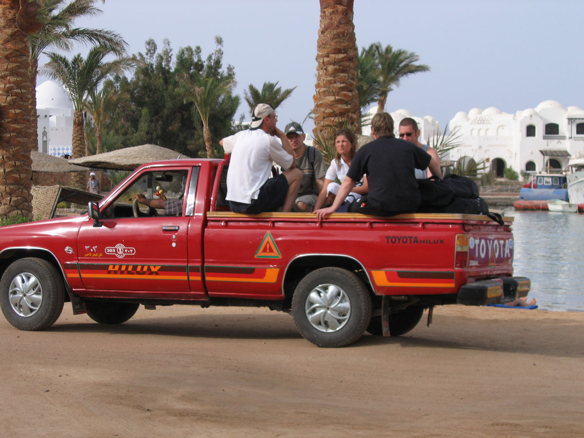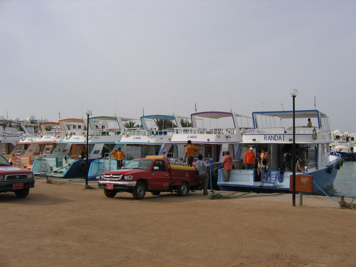 Ganztagesfahrten beginnen um 8 Uhr 30, kurz vorher trifft man sich an der Basis, um die Bootsaufteilung zu erfahren und sich ggfls. mit Ausrüstung und Verpflegung (Getränken) zu versorgen. Pick-Ups übernehmen den sehr kurzen Transfer zur Anlegestelle der Boote. An Bord stehen bereits ausreichend Flaschen und Blei bereit. Üblicherweise fragt der Guide dann nach Wünschen bzgl. der Tauchplätze. Je nach Wetter- und Seebedingungen sowie Zusammensetzung der Gäste werden die Vorschläge dann umgesetzt oder durch Alternativangebote des Guides ergänzt. Dabei wird darauf geachtet, dass der Wiederholungsfaktor auch für Taucher, die ganze Pakete gebucht haben, so gering wie möglich gehalten wird. Die Mischung zwischen flacheren sehenswerten Fotospots, Drifttauchgängen und tieferen Spots empfand ich als gelungen.