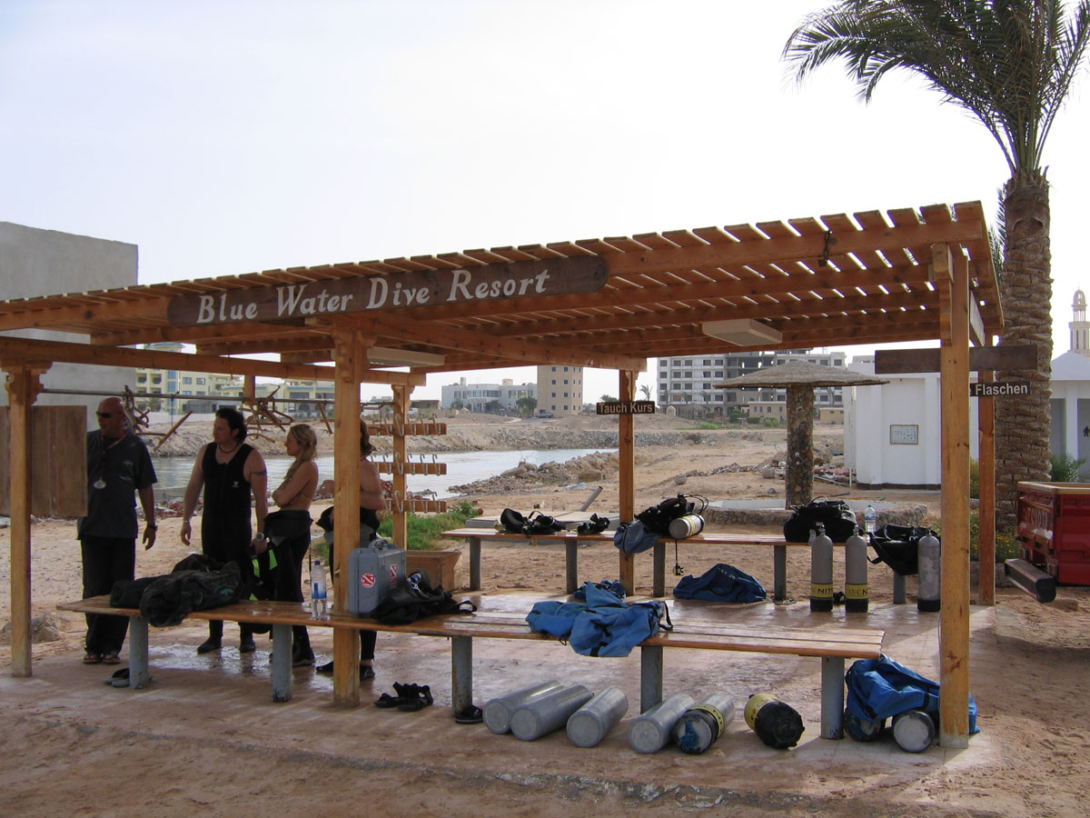 Zwischen den Hotels Arabia Beach Resort und Arabella im Norden von Hurghada liegt das Blue Water Dive Resort, das von Mitte der 1990er Jahre bis zum Jahr 2007 (also auch während meines Aufenthaltes) von Mike & Margret betrieben wurde. Inzwischen haben sich die beiden Betreiber aus dem Geschäft zurückgezogen. Hinter den neuen Betreibern stecken James&Mac, die schon lange zuvor die Basis und ihre Abläufe mitgeprägt hatten. Beide sind mit ihrer Stammbasis im Giftum Beach Resort Qualitätsgaranten.