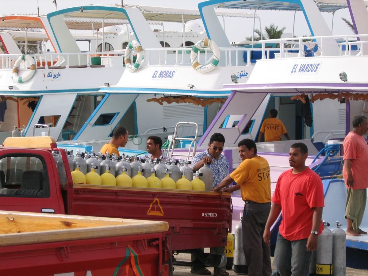 Auf den Booten gibt es bis auf Tee keine Getränke. Also gilt es, sich vor Tourbeginn ausreichend mit Wasser zu versorgen. Die Bar in den Räumen der Tauchbasis, bei der man Wasser in 1,5l-Flaschen erwerben kann, wird vom Hotel Arabella betrieben. Gäste des Hotels mit All Inclusive - Arrangement können sich unbegrenzt, Gäste mit All Inclusive - Buchung des Arabia Beach Resort mit zwei Flaschen täglich kostenlos versorgen. Alle anderen Gäste zahlen den normalen Listenpreis der Bar oder bringen eigene Getränke mit. Seit 2004 bietet die Tauchbasis Nitrox32 an. Wer den Nitrox-Schein beim Blue Water Dive Resort gemacht hat, erhält im Rahmen der "Nitrox-for-free" - Kampagne das sauerstoffangereicherte Gas immer kostenlos. Ansonsten wird ein Aufpreis von 2,- Euro für eine Füllung verlangt. Alternativ kann man eine "Nitrox-Karte" für 30,- Euro kaufen und erhält dann immer (auch bei Folgebesuchen) Nitrox ohne Aufpreis. Diese Karte ist auch im der Partnerbasis "James & Mac" gültig. Sowohl für Nitrox also auch für normale Pressluft stehen 12l - Aluflaschen mit DIN-Anschluss in großer Stückzahl und einige 15l-Stahlflaschen bereit.