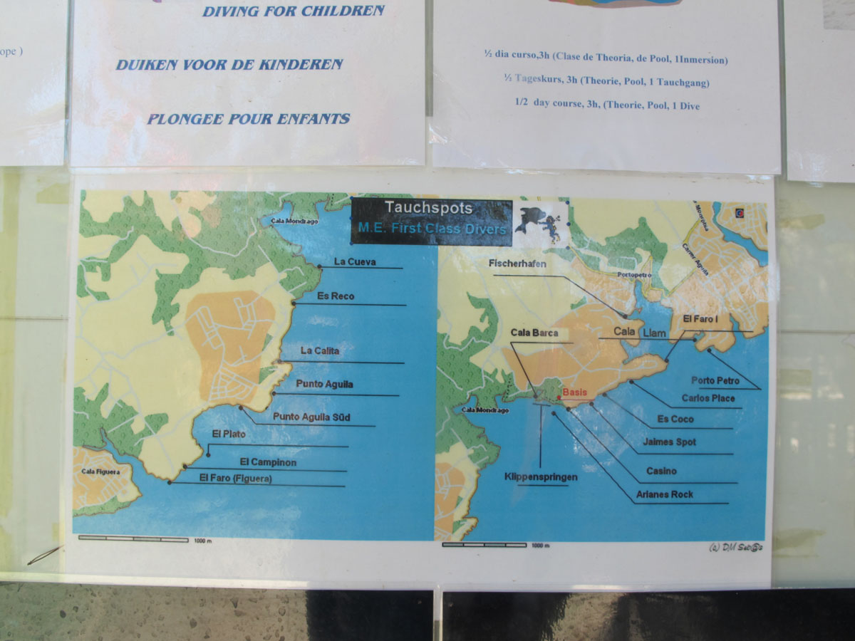 Die vage Hotelbeschreibung, hier gebe es eine Tauchbasis, war mit etwas Internetrecherche schnell konkretisiert. Doch was war das? In so einem Nest gleich zwei Basen, noch dazu im gleichen Hotel? Ein Tauchermekka? Nein, es war anders. Zunächst stieß ich auf eine Basis der Dressel Divers, eine spanische Kette. Dann entdeckte ich noch das Angebot der M. E. First Class Diver, eine kleine Tauchbasis, die von Birgit Fruth und Ralf Ballheim betrieben wird. Es stellte sich heraus, dass es sich um die gleiche Basis handelt, die offenbar unter zwei Namen auftritt. Wozu das gut sein soll? Keine Ahnung. Ob Dressel Divers nun eine Beteiligung an der Basis hält oder M. E. First Class Diver ein Lizenz- oder Franchisenehmer von Dressel Divers ist, konnte ich nicht abschließend herausfinden.