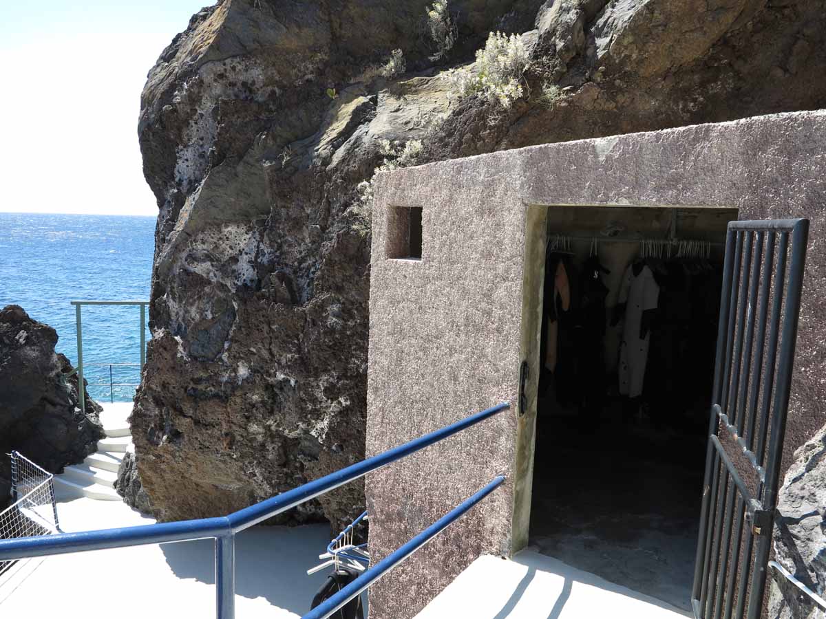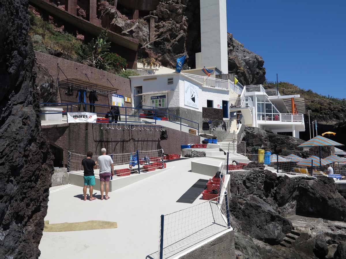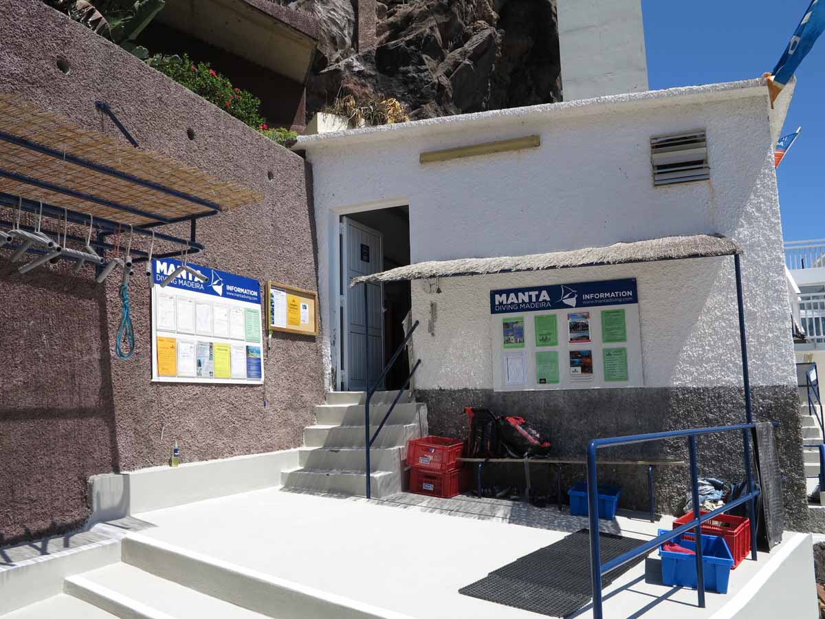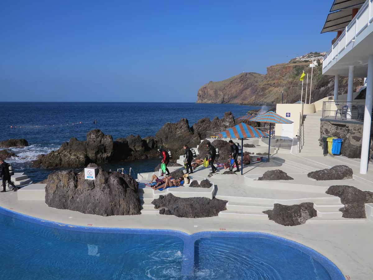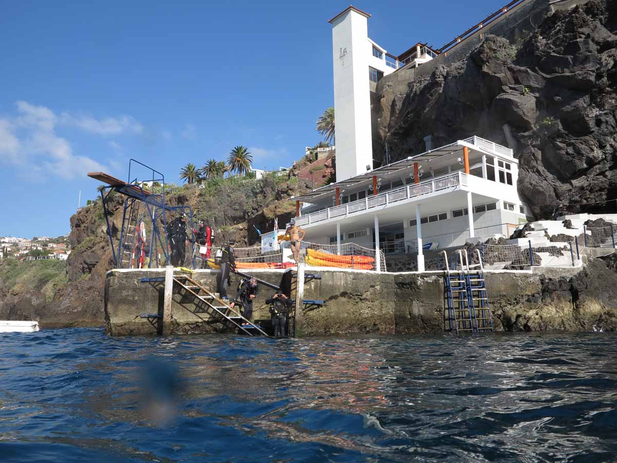 Manta Diving gehört keiner großen Kette an, sondern ist noch ganz klassisch inhabergeführt. Die Basis liegt im Südosten von Madeira. Auf der halben Strecke zwischen dem Flughafen und der Inselhauptstadt Funchal befindet sich der kleine Ort Canico. Canico ist ein nettes kleines Örtchen. Das größte Hotel vor Ort ist der hässlichste Bau - ein riesiger RIU-Bunker direkt am Strand. Sonst dominieren kleine Ferienwohnungen und kleinere Hotels. Das Galosol Resort ist so ein kleines Hotel. Es besteht aus drei separaten Hotels, eines direkt an der Steilküste, eines in etwas höherer Lage dahinter und ein bisschen entfernt noch ein drittes, kleines Boutique-Hotel. Ja richtig: Steilküste. Klassischen Sandstrand gibt es hier nicht, aber an der Küste ist ein sogenanntes Lido, ein öffentliches Strandbad, errichtet, das zum Galomar-Resort gehört. Über eine öffentliche Nebenstraße erreicht man zunächst eine Bar, die sich oberhalb auf der Steilküste befindet. Von dort führt eine in den Fels gehauene Treppe und alternativ ein Fahrstuhl vier Etagen tiefer zum Lido. Hotelgäste nutzen die Einrichtung kostenlos, andere Gäste zahlen einen kleinen Tageseintritt.