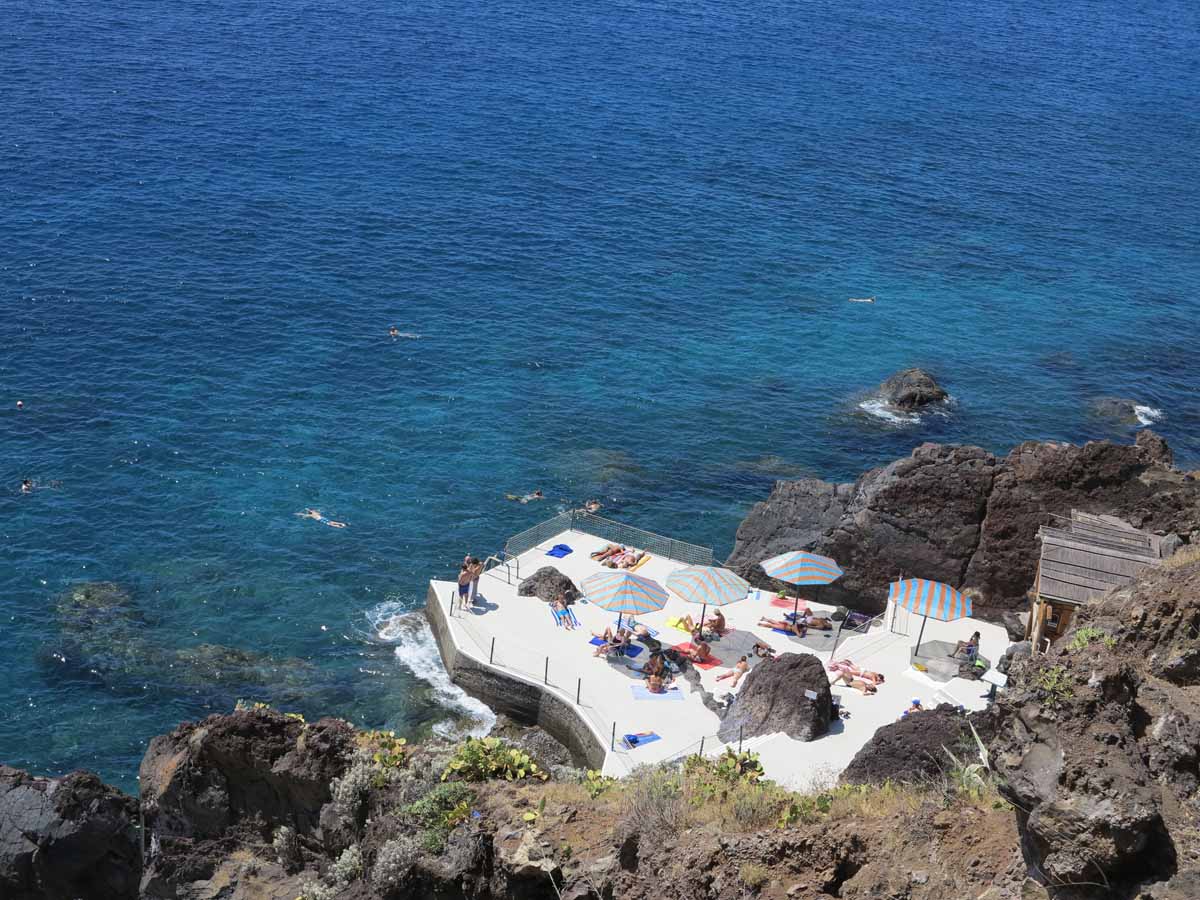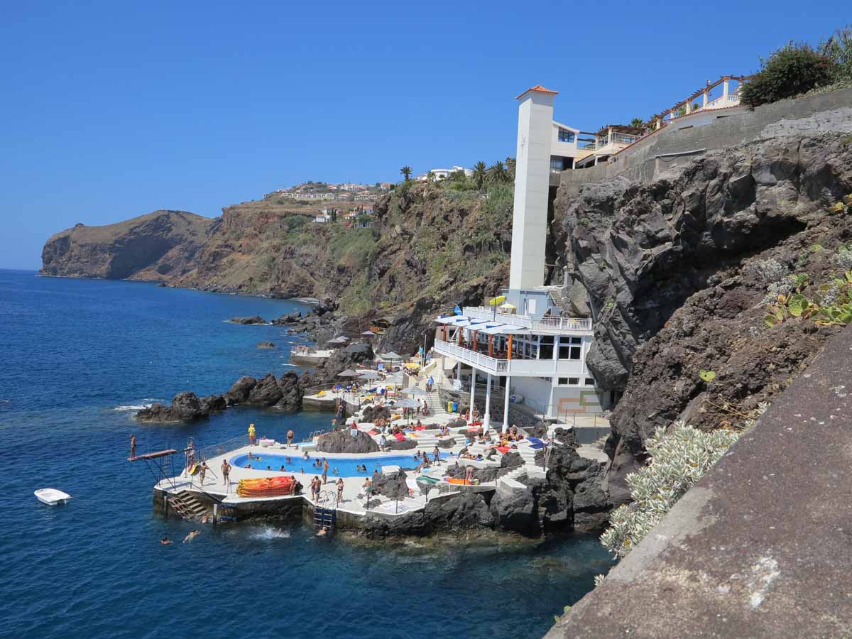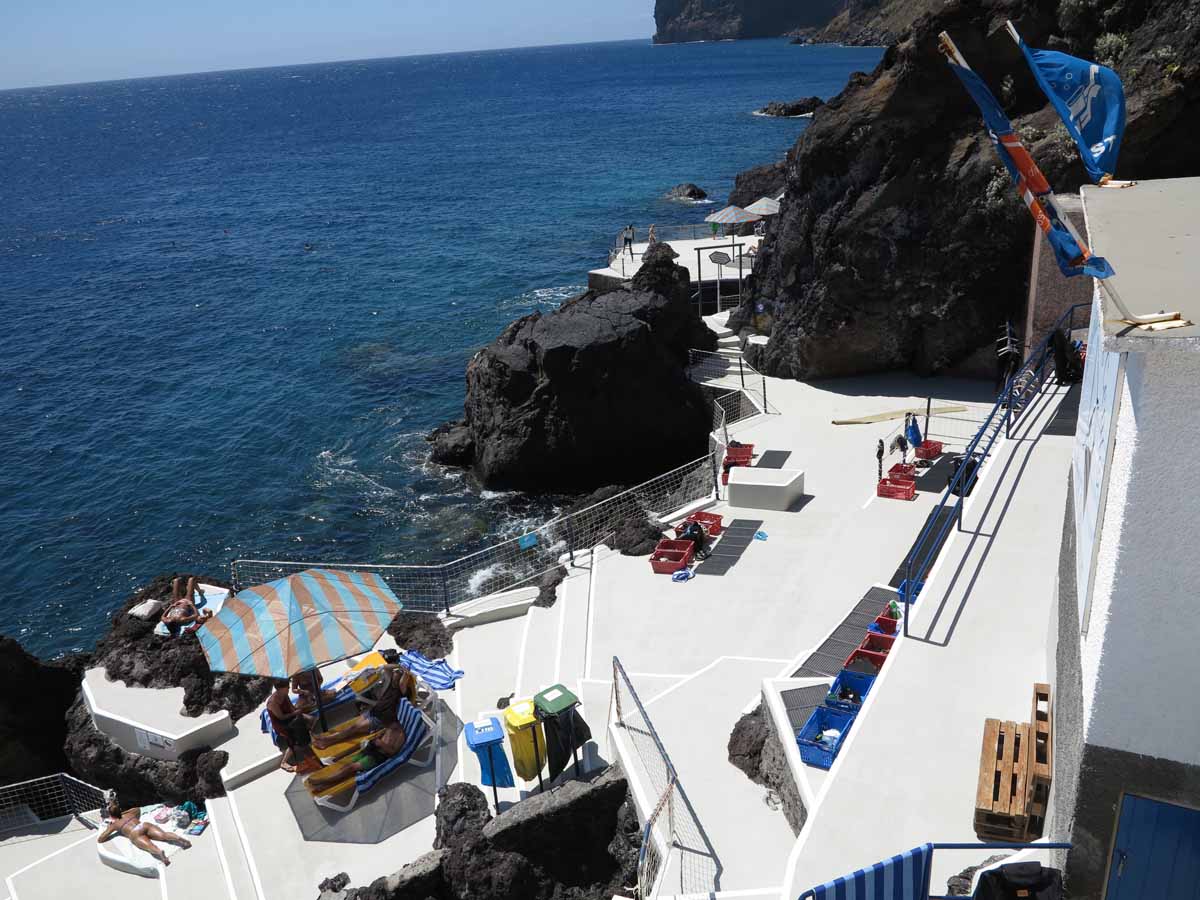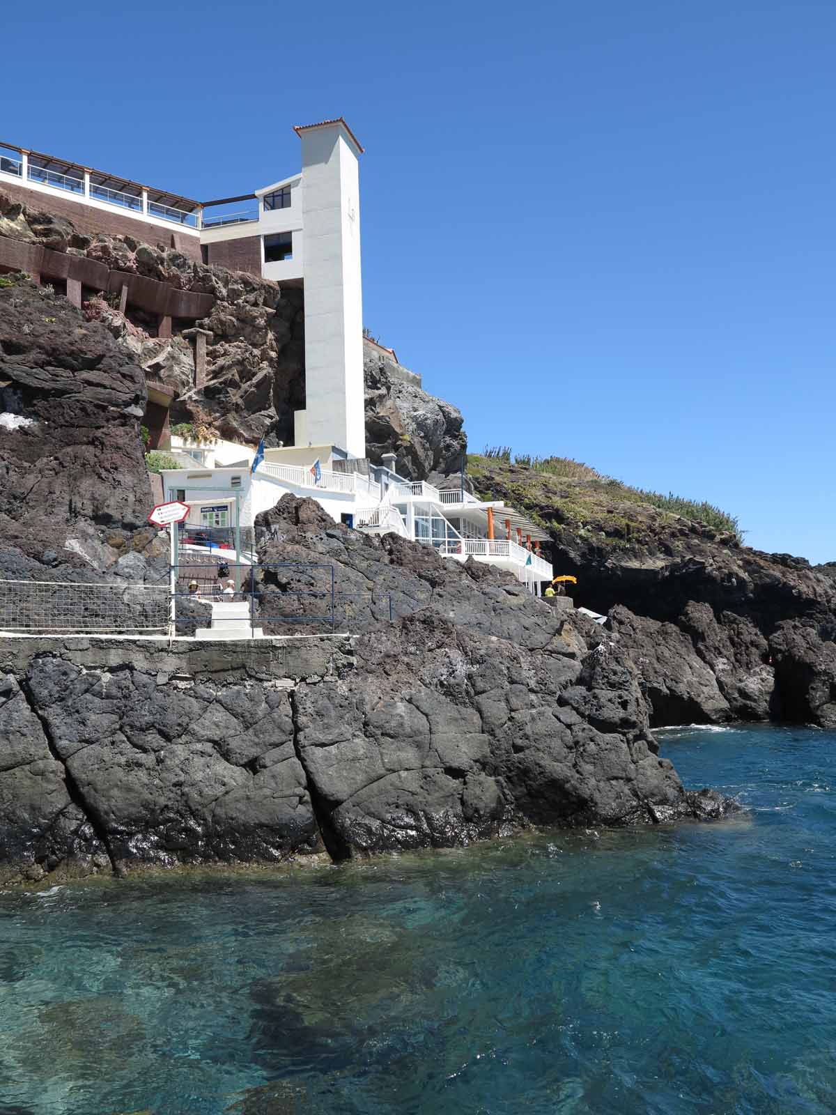 Manta Diving gehört keiner großen Kette an, sondern ist noch ganz klassisch inhabergeführt. Die Basis liegt im Südosten von Madeira. Auf der halben Strecke zwischen dem Flughafen und der Inselhauptstadt Funchal befindet sich der kleine Ort Canico. Canico ist ein nettes kleines Örtchen. Das größte Hotel vor Ort ist der hässlichste Bau - ein riesiger RIU-Bunker direkt am Strand. Sonst dominieren kleine Ferienwohnungen und kleinere Hotels. Das Galosol Resort ist so ein kleines Hotel. Es besteht aus drei separaten Hotels, eines direkt an der Steilküste, eines in etwas höherer Lage dahinter und ein bisschen entfernt noch ein drittes, kleines Boutique-Hotel. Ja richtig: Steilküste. Klassischen Sandstrand gibt es hier nicht, aber an der Küste ist ein sogenanntes Lido, ein öffentliches Strandbad, errichtet, das zum Galomar-Resort gehört. Über eine öffentliche Nebenstraße erreicht man zunächst eine Bar, die sich oberhalb auf der Steilküste befindet. Von dort führt eine in den Fels gehauene Treppe und alternativ ein Fahrstuhl vier Etagen tiefer zum Lido. Hotelgäste nutzen die Einrichtung kostenlos, andere Gäste zahlen einen kleinen Tageseintritt.