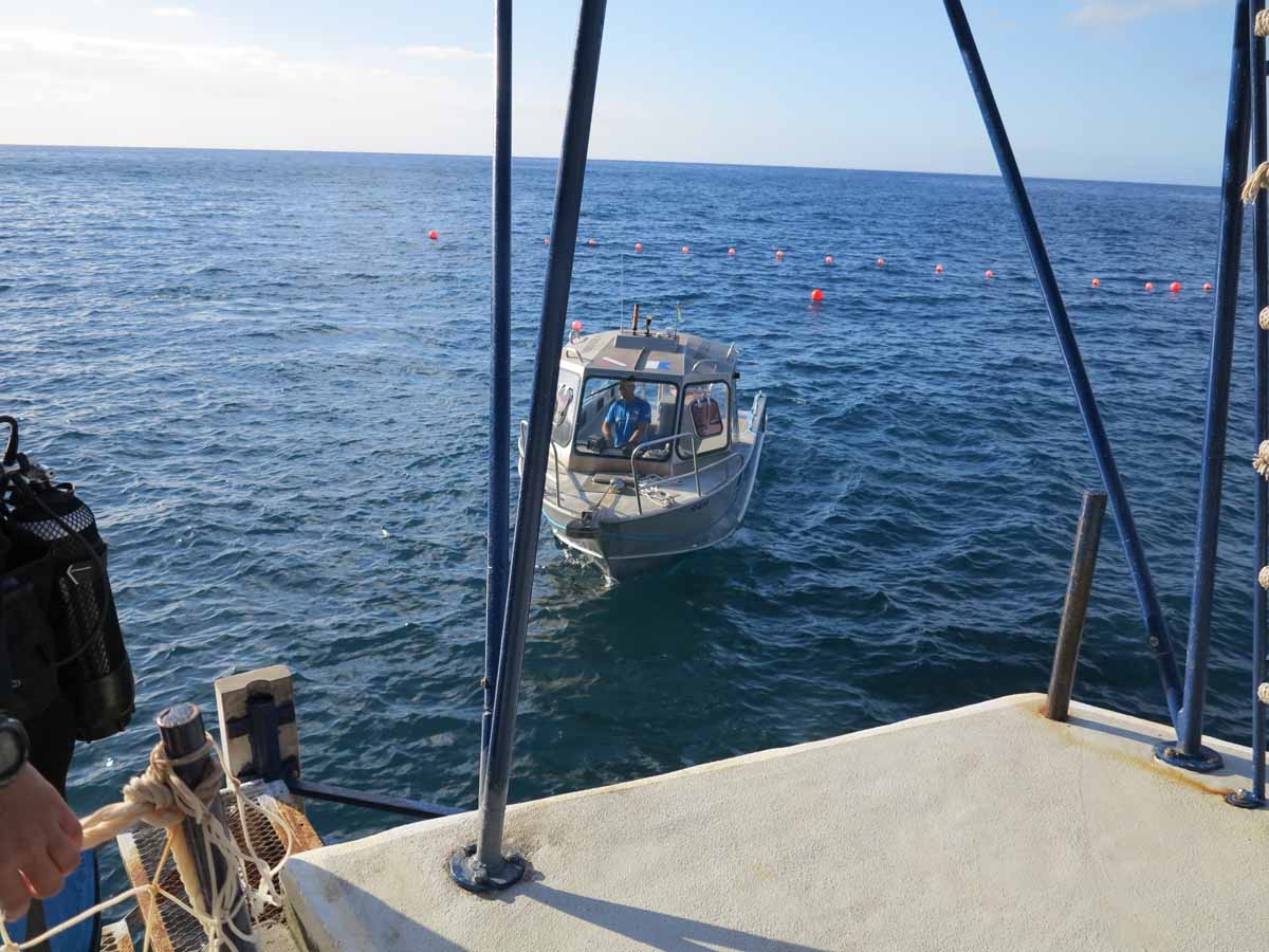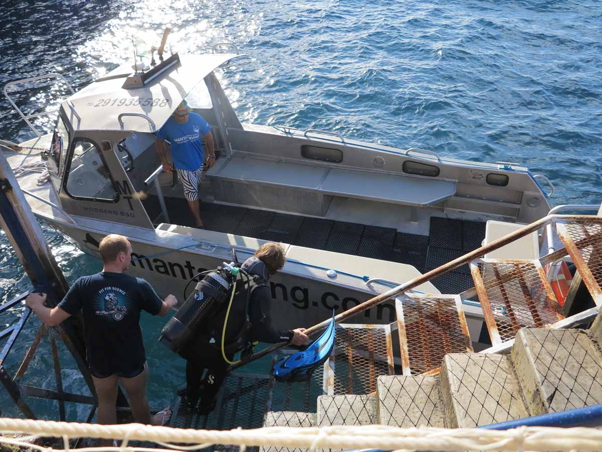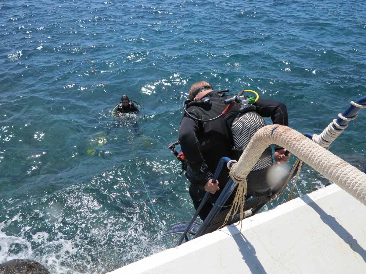An drei Tagen in der Woche werden je zwei Ausfahrten mit dem basiseigenen Boot angeboten. Das Boot legt direkt von einer Treppe an der Badeplattform ab. Ein- und Ausstieg können etwas schwierig sein, da es keinen richtigen Steg gibt und das Boot auch nur festgehalten und nicht festgemacht werden kann. Wer aber den präzisen Anweisungen folgt, schafft das. Das Boot selbst bietet genug Platz für ca. 10-12 Taucher und eine kurze Ausfahrt. Ins Wasser geht es mit dem klassischen Sprung von einer Plattform, zurück kommt man über eine Flossenleiter. Die meisten Tauchplätze, die mit dem Boot angefahren werden, sind etwas anspruchsvoller. Das definiert sich entweder über die Tauchtiefe oder die vorhandenen Strömungen. Nicht selten besteht die Möglichkeit, einen Drift-Dive zu machen und sich am Ende des Tauchgangs einsammeln zu lassen. Das dabei Bojen obligatorisch sind, bedarf keiner langen Erläuterung. Auch bei den Bootstauchgängen gibt es nach Absprache die Möglichkeit, mit oder ohne Guide zu tauchen.