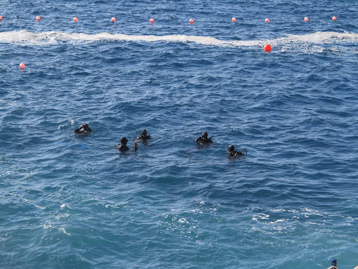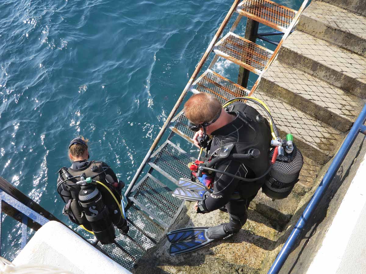 Der erste Tauchgang ist immer ein Tauchgang am Hausriff. Er beginnt mit einem ausführlichen Briefing, wenn es nicht schon bei Check-In der Fall war, werden hier auch die Abläufe auf der Basis erläutert. Eine gute Tauchplatzbeschreibung samt Karten folgt. Der Tauchgang beginnt und endet an einer Leiter der Badeplattformen - wer den Ausstieg über eine Leiter an einer Felswand bei möglichen Wellengang nicht kennt, wird die Hinweise, die beim Briefing dazugehören, dankbar berücksichtigen. An Anfang des Tauchgangs stehen zwei kleine Checks: Simulation einer vollgelaufenen Maske und eine "zu-wenig-Luft" - Situation mit Oktopus-Atmung beim Tauchpartner. Danach folgt ein normaler Tauchgang, am Ende wird bei weitestgehend leerer Flasche noch ein Tariercheck gemacht. Selten, aber gut: Die Guides nehmen sich hinterher Zeit für ein Debriefing, wo es darum geht, noch mal besprechen, was man denn so an Unterwasser-Lebewesen gesehen hat.