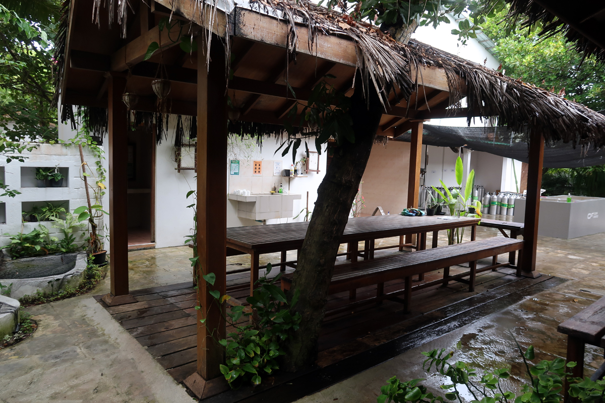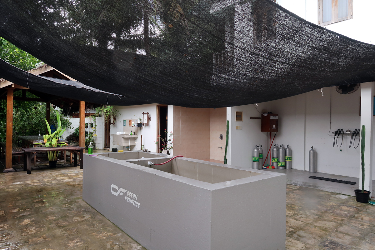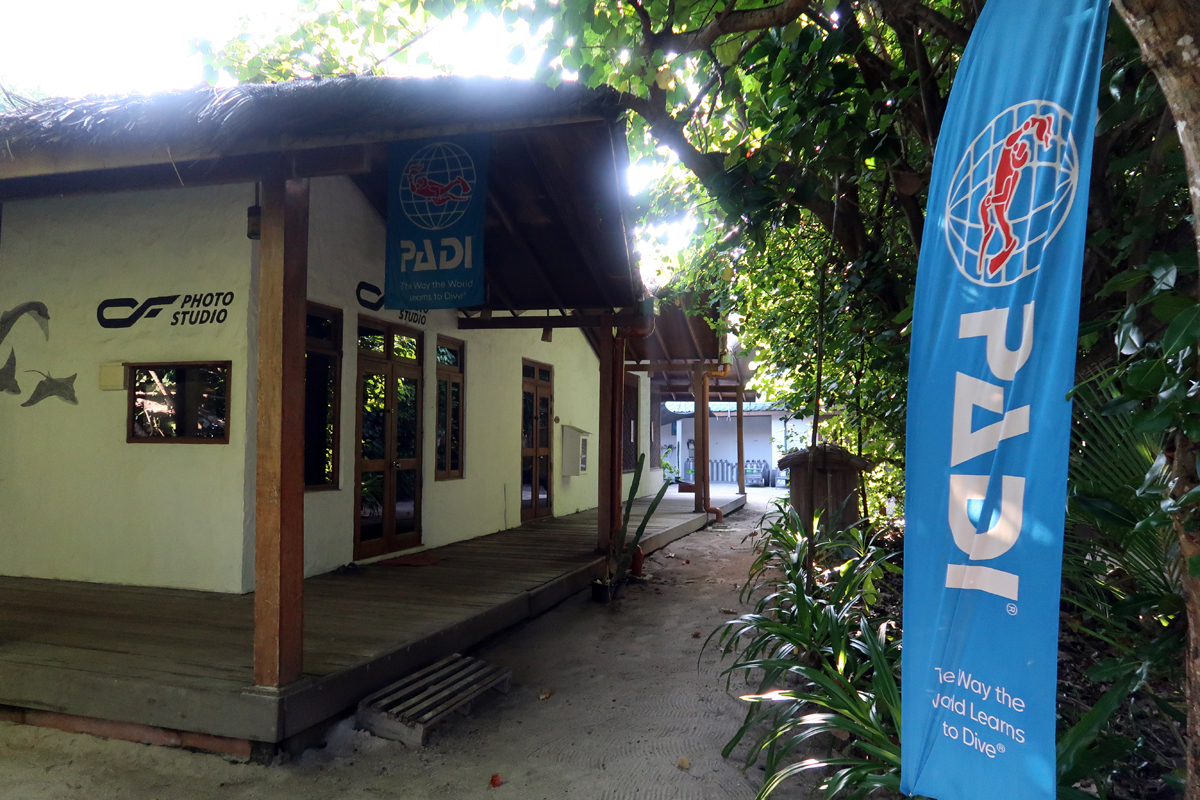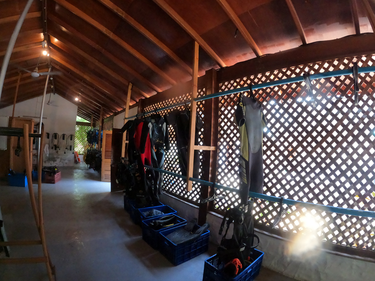 Die Tauchbasis gehört zum Hotel, was schon daran sichtbar wird, dass hier keine große Kette aktiv ist und die Abrechnung zum Schluss über die Zimmerrechnung erfolgt. So ist auch die Vorausbuchung von Tauchpaketen nicht üblich und nicht nötig. Klar: Die Anzahl der Gäste auf so einer Malediveninsel ist gut kalkulierbar und Auslastungswerte wird man im Basismanagement sicher sehr genau kennen, so dass solche Maßnahmen nicht nötig sind. Was im übrigen auch seitens der Gäste kurzfristige Entscheidungen zu tauchen leicht macht.