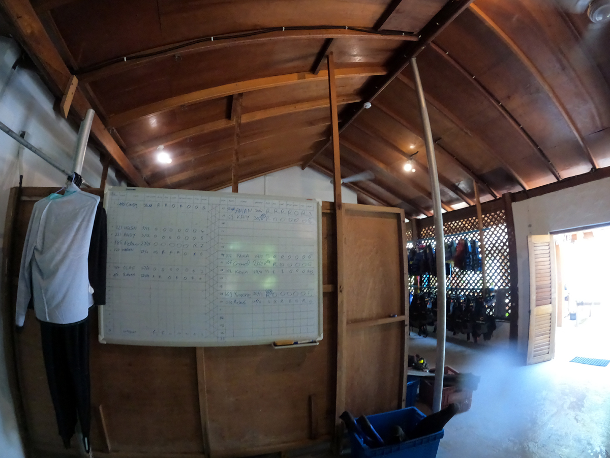 Wer eigenes Equipment mitbringt, kann es in der nachts verschlossenen Basis unterbringen. Für jeden Taucher gibt es eine nummerierte Box, in die das Kleinzeug reinkommt. Im Materialraum sind Stangen und Bügel für Jackets und Anzüge vorhanden. Man stellt all sein Krempel an einer Stelle zusammen (Anzug, Jacket auf zwei zusammengehörige Bügel, Box darunter) und wenn dann ein Tauchgang ansteht und die Crew die Boxnummer kennt, stellt sie alles rechtzeitig vorher raus oder bringt es vor einer Bootsfahrt an Bord. Das funktioniert gut eingespielt und reibungslos.