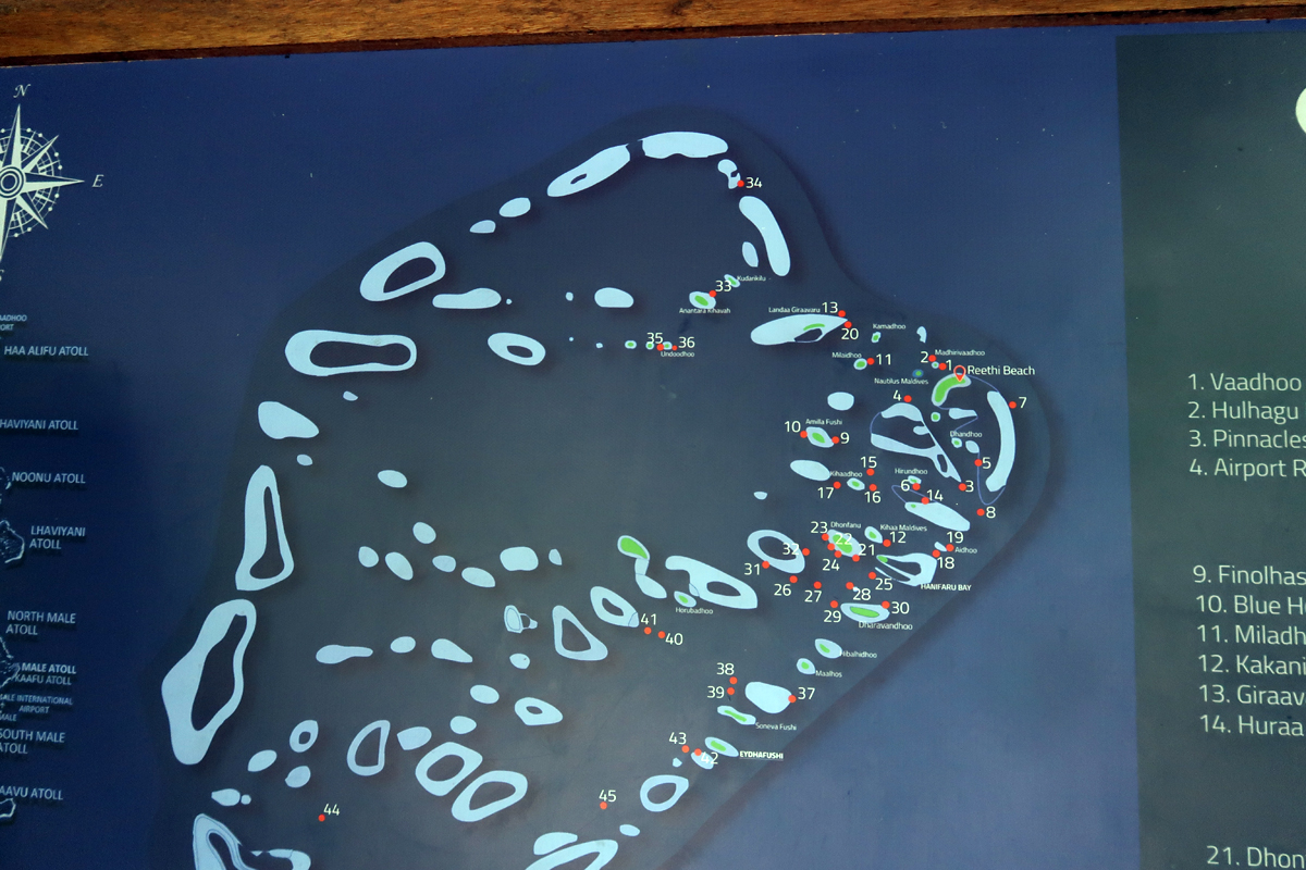 Ansonsten ist Reethi Beach (Fonimagodhoo) nichts für Fans des Hausriffstauchens auf maledivische Art. Auf der Inselseite mit den Bungalows gibt es drei markierte Zugänge, die mit Seil und Boje gekennzeichnet sind und wo eine Schneide ins Korallendach geschlagen wurde. Dies richtet sich primär an Schnorchler. Weder gibt es die von anderen Inseln bekannten Einrichtungen in der Nähe der Einstiege für die Taucher, um Ausrüstung abzulegen oder zusammenzubauen noch irgendeinen Flaschenservice, um die Stellen zu nutzen. Karten, Beschreibungen, Informationen zum Hausriff auf der Basis sind Fehlanzeige.