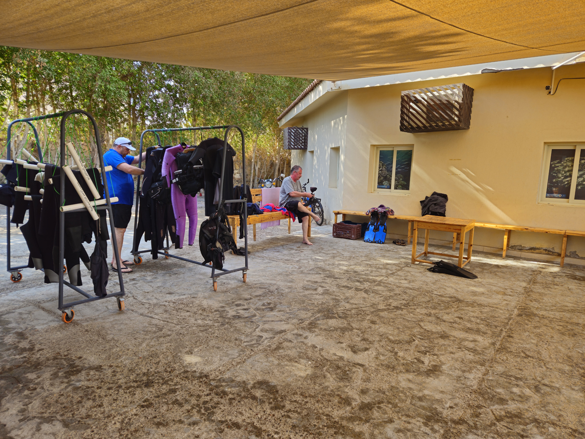 Die Basis verschiedene kleine Ecken für das gemütliche Beisammensitzen nach den Tauchgängen, eigene Duschen und Toiletten und natürlich nicht zu vergessen für das Spülen der Ausrüstung mehrere gut dimensionierte Spülbecken. Ein separates Becken ist dabei nur für Regler, Masken und Kameras reserviert, die Gäste nehmen das mit der Sortierung der Spülbecken aber häufig nicht so genau. Getaucht wird üblicherweise mit 12l-Alu-Flaschen mit DIN-Anschluß. 15l - Flaschen werden gegen Aufpreis gefüllt.