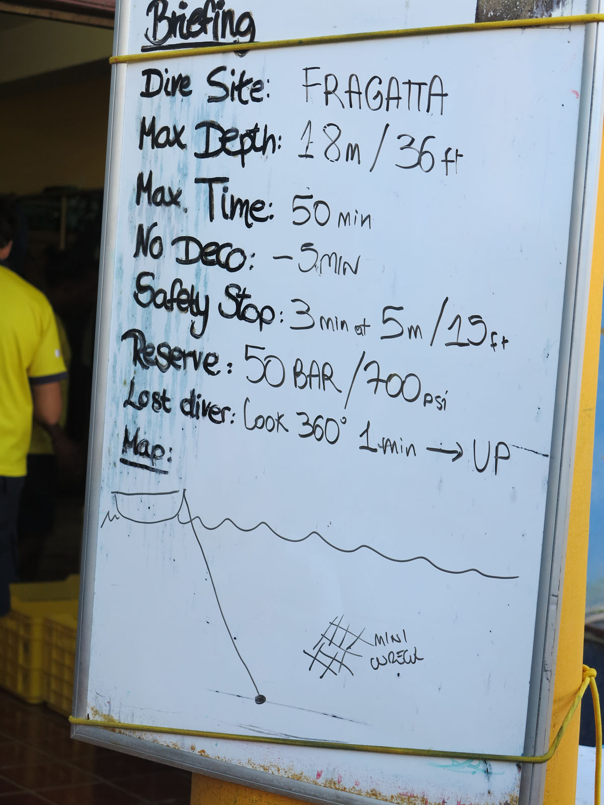 Zu jedem Tauchgang gehört vorweg ein mehr oder weniger umfassendes Briefing. Wiederholt wurden jedesmal Zeichen und Auftauchregeln bis hin zum obligatorischen Sicherheitsstopp auf der 5 Meter-Linie, mitunter gab es auch zum Tauchplatz selbst ein paar Informationen, das war aber nicht durchgängig der Fall.