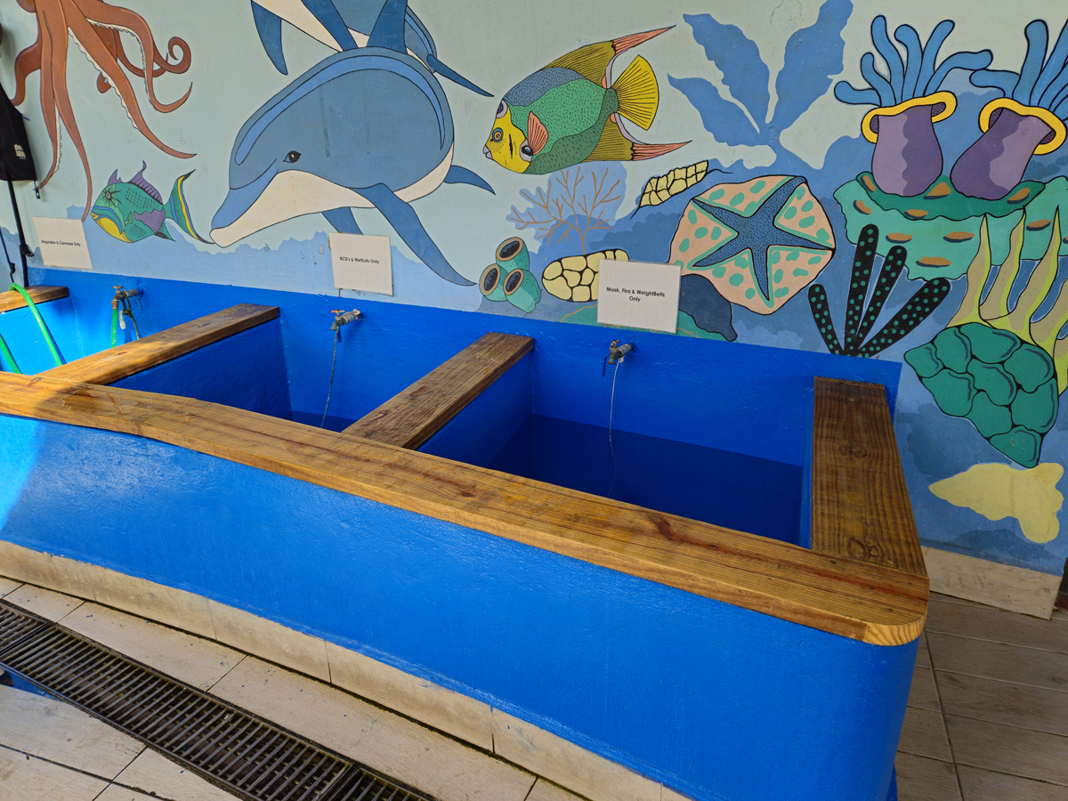 Vor dem Materialraum sind insgesamt drei Spülbecken. Das System ist eigentlich gut durchdacht und es ist mit Text und Fotoschildern angezeigt, was wo gereinigt werden soll, doch in der Praxis scheint das für einige Taucher bereits zu kompliziert zu sein. Doch das Wasser wurde ausreichend häufig gewechselt. Einen Kompressor habe ich direkt an den Räumlichkeiten der Basis nicht gesehen. Ob der irgendwo anders auf dem großen Hotelgelände stand oder man hier einen gemeinsamen Flaschenservice mit anderen Tauchbasen nutzt, war nicht herauszubekommen. Wichtig sind dabei sicher noch die Eckdaten: Getaucht wird mit 12l-Alu-Flaschen. Die meisten Flaschen haben einen DIN-Anschluß mit eingesetzten INT-Adapter, d.h. die Umrüstung auf DIN wird von der Basis schnell vorgenommen. Wer über ein Nitrox-Brevet verfügt, taucht "Nitrox for free", kann also ohne Aufpreis Nitrox bekommen. Vorbildlich. Nur der Analyser für die Gäste müsste mal wieder ausgestauscht werden.